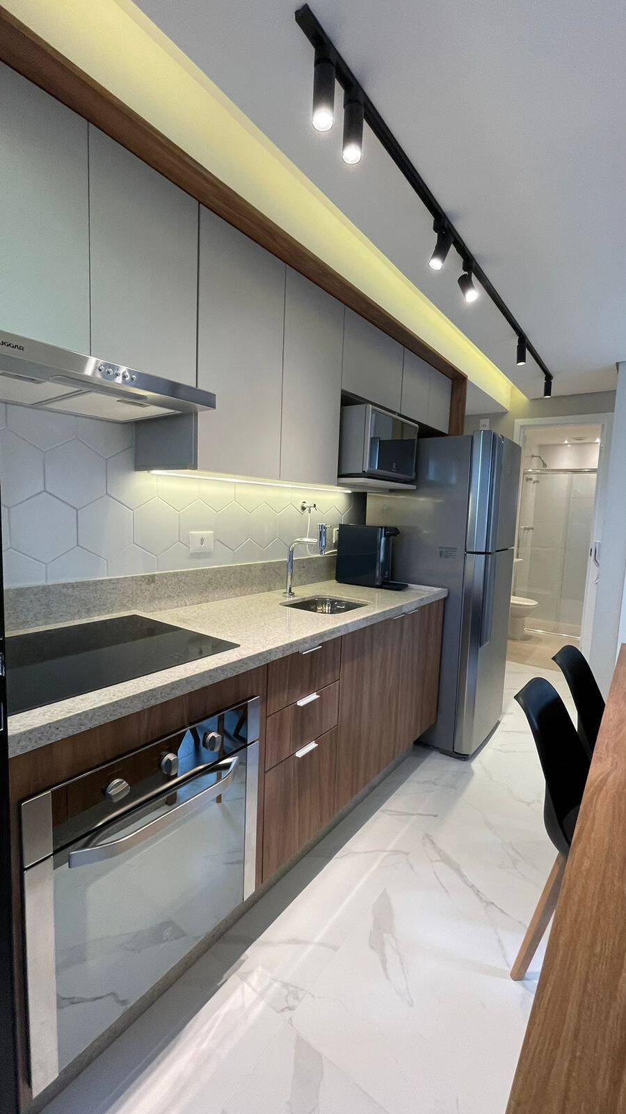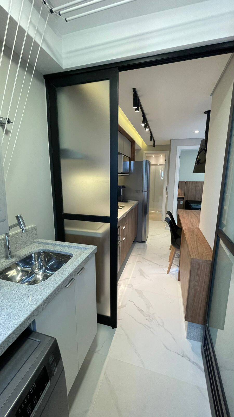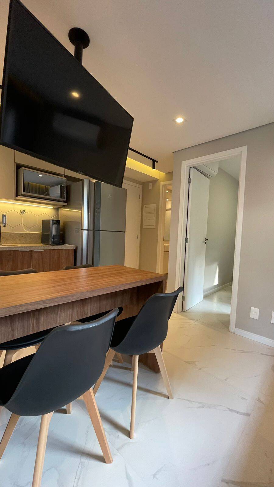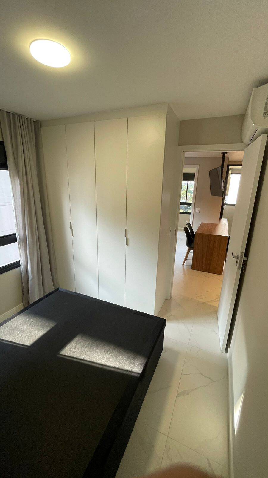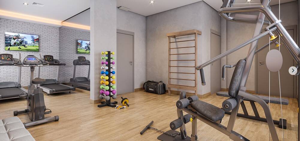 Armários na cozinha, lavanderia, banheiro, Geladeira dúplex, micro-ondas, forno elétrico, cooktop de indução, coifa, filtro de água, máquina de lavar e secar, TV, sofá, Box de cama de casal, iluminação completa com led, torneiras com aquecimento, ar condicionado no quarto e na sala, Box de vidro, amplo espelho no banheiro, varal retrátil. Todos os eletrodomésticos e móveis são novos (sem uso).