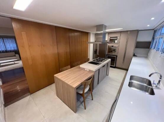 Cozinha planejada com ilha gourmet e porta de correr de madeira natural que integra os ambientes.