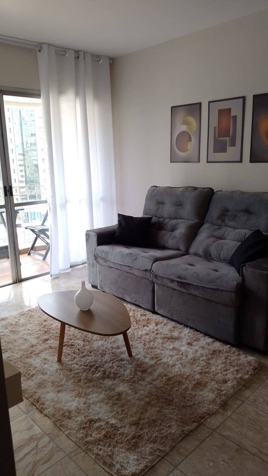 Apartamento de 2 quartos e 2 vagas de garagem, com armários embutidos e piso em mármore travertino. Localizado de frente para o norte, possui ar-condicionado quente e frio, varanda e está mobiliado, com móveis 90% novos ou seminovos.Valor:R$ 7.000,00