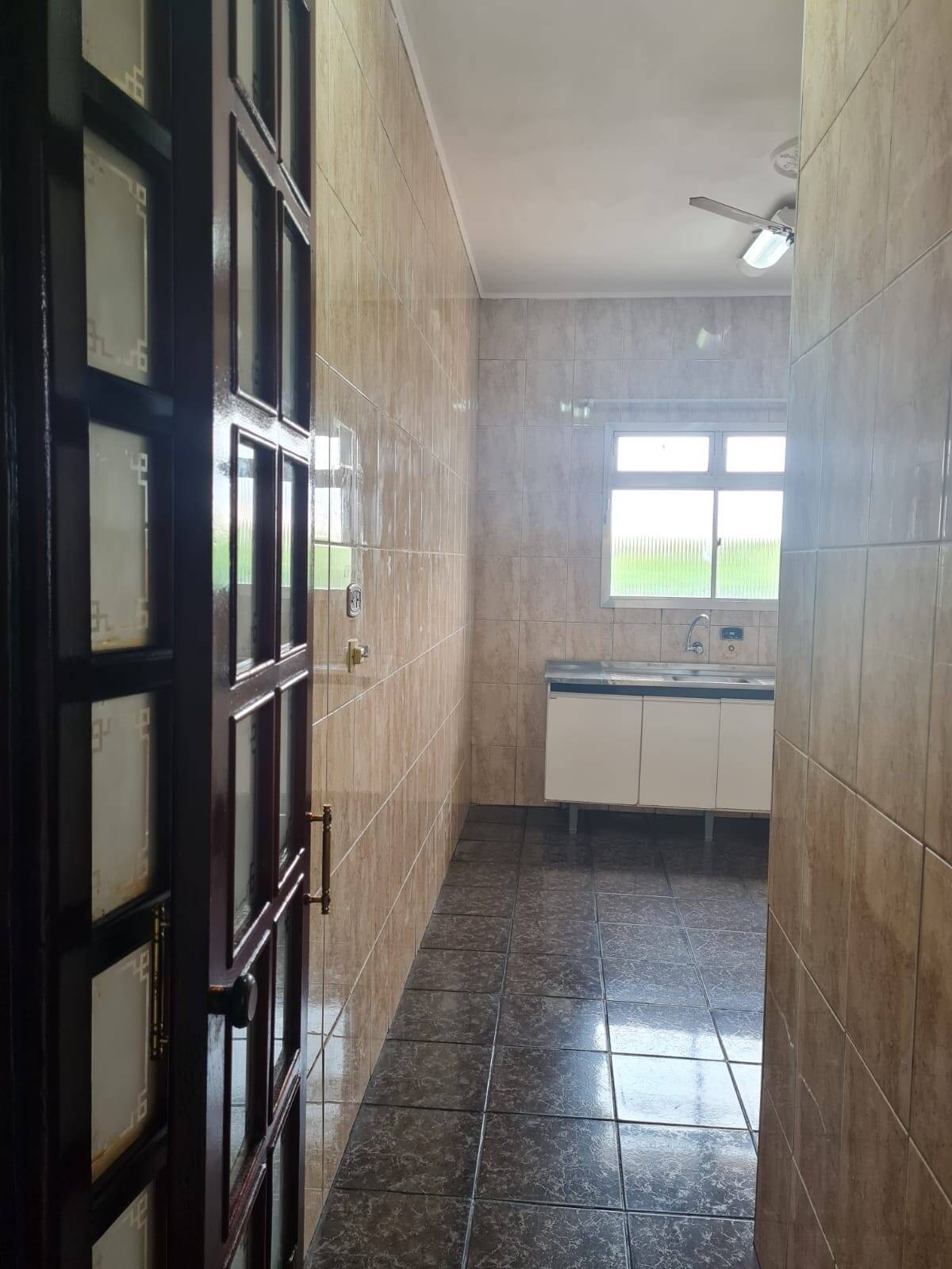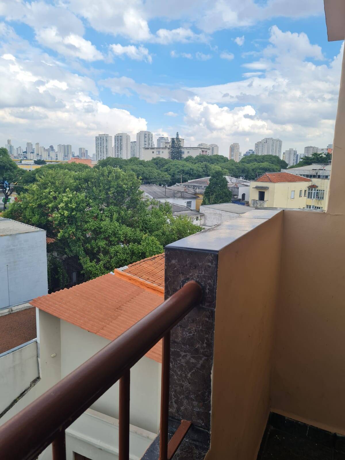 Sacada com vista livre, sala ampla, cozinha e área de serviço.