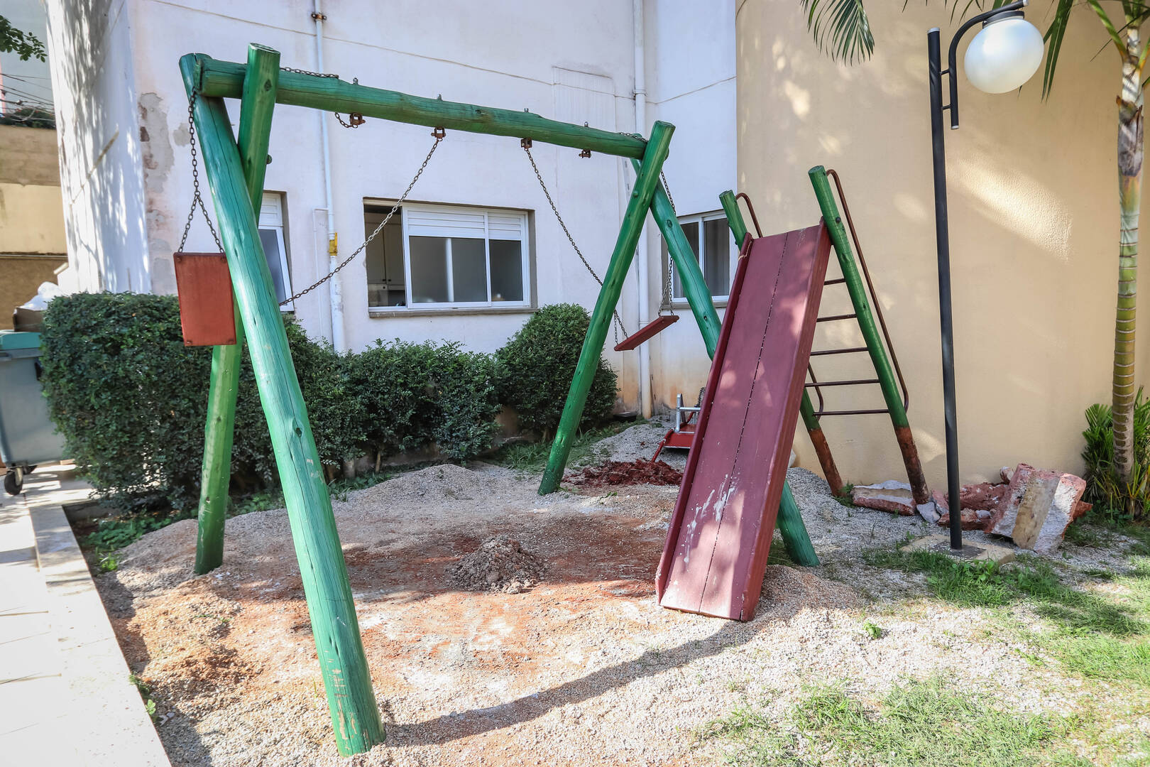 Amplo térreo com equipamentos de ginástica ao ar livre e uma linda queda d'água