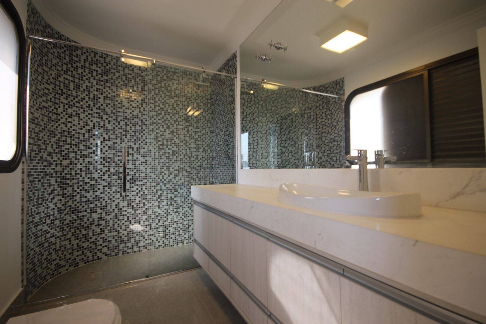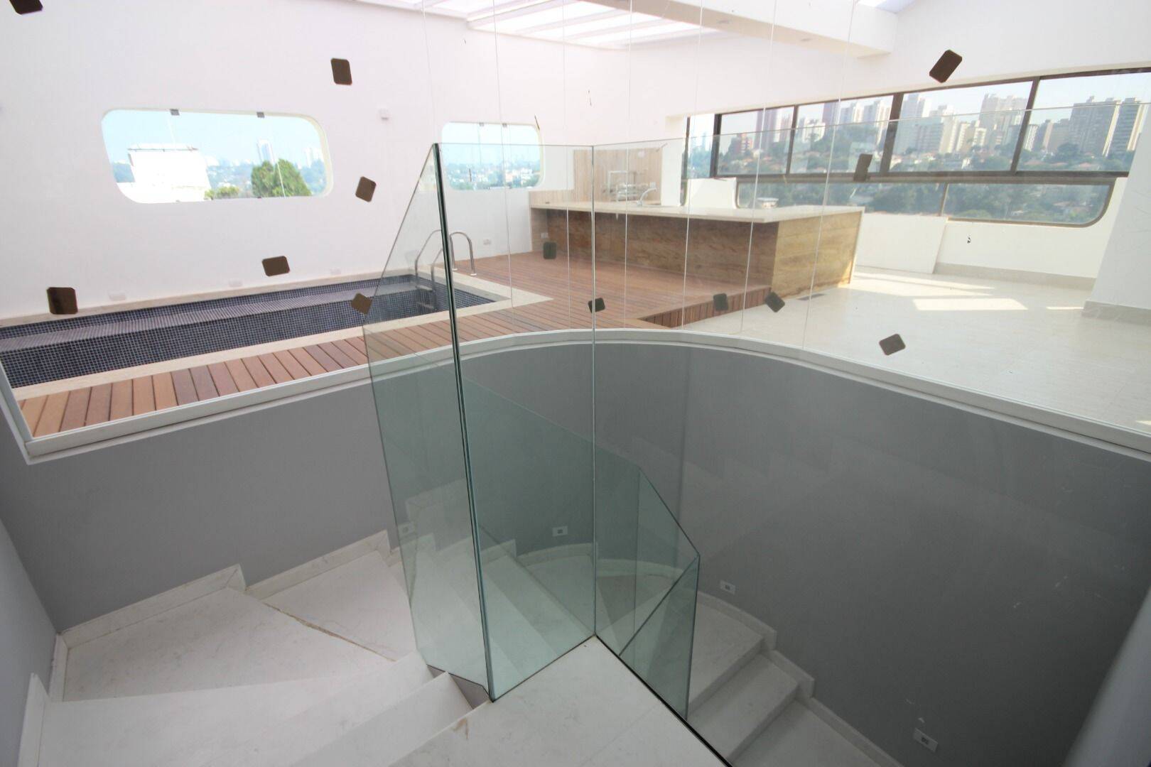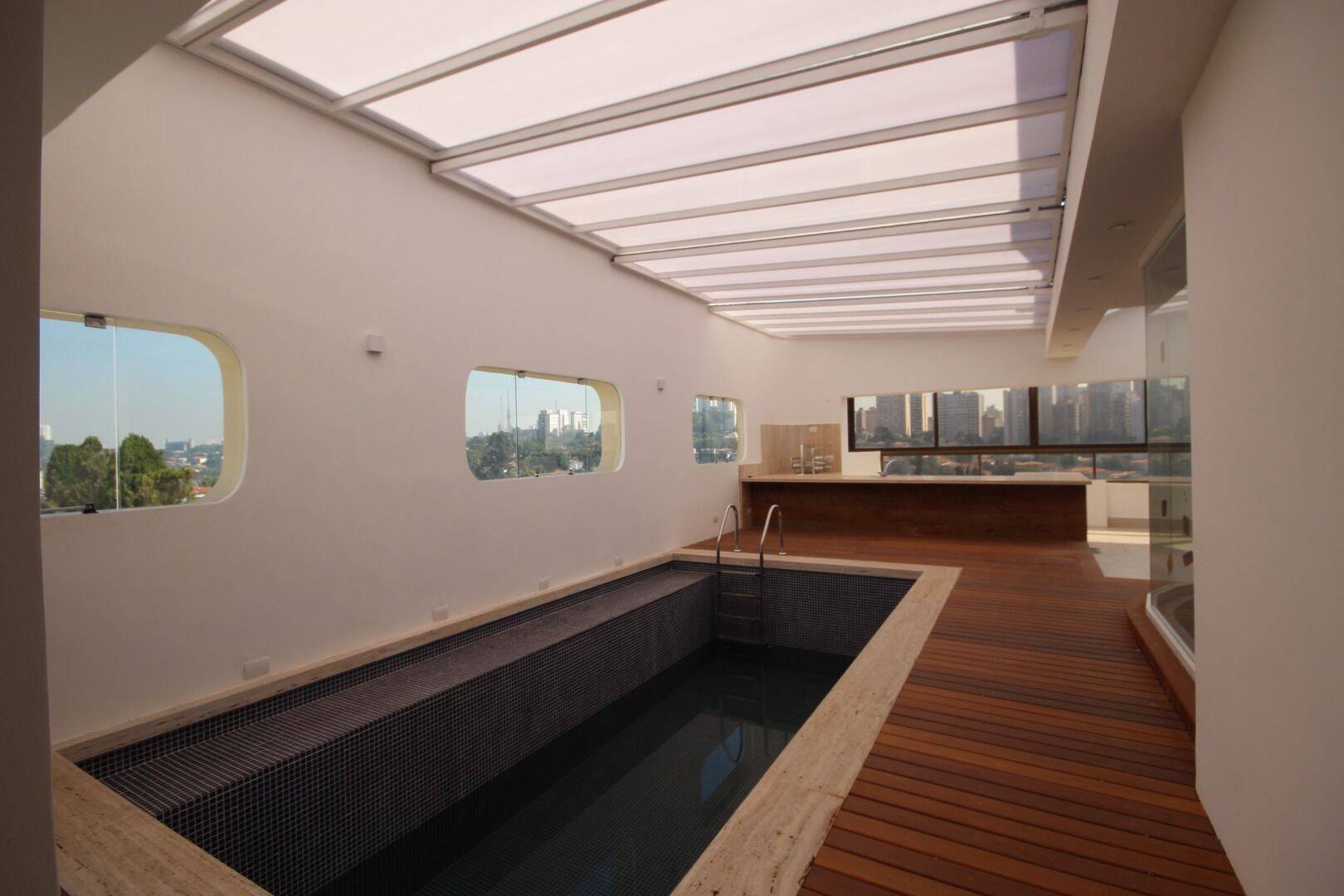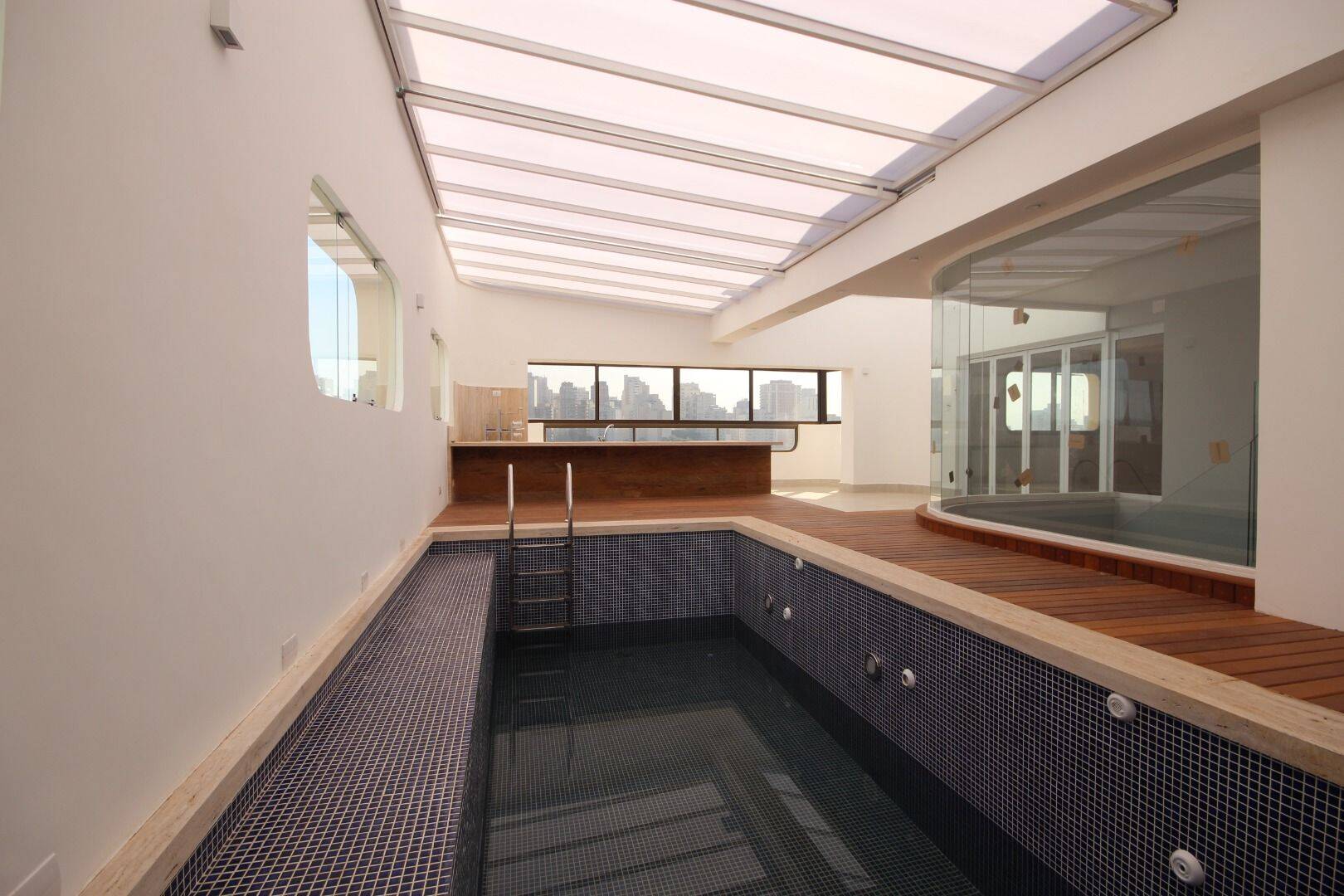 O andar superior revela um espaço deslumbrante composto por um amplo living, sala de jantar, lavabo, cozinha equipada, área de piscina com cozinha gourmet integrada, sauna úmida, sanitário adicional, uma piscina aquecida com teto retrátil, área de serviço independente e um quarto com banheiro exclusivo para colaborador(a). Equipamentos de última geração, como ar condicionado nas suítes e armários embutidos, complementam o conforto e a praticidade deste imóvel exclusivo.
