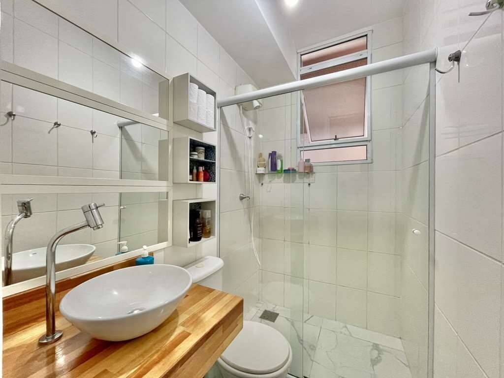 - Banheiro com espelho e box de vidro.