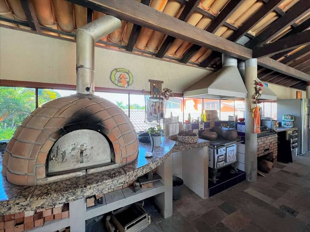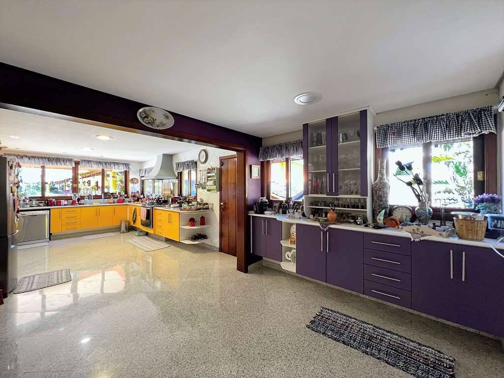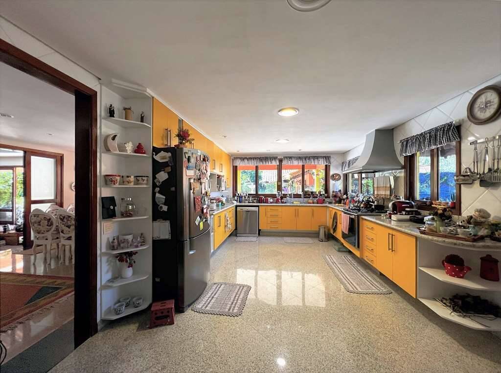 - Cozinha grande repleta de armários planejados, voltada para o lazer com jardim, bancada de granito em “U” com 3 cubas e grande despensa. Fogão 5 bocas Electrolux, coifa e geladeira Brastemp