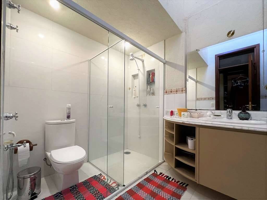 - Banheiros com bancadas em mármore, espelhos, gabinetes, box de vidro e nichos. Sendo a master uma sala de banho com 2 acessos, 2 espelhos, 2 cubas, 2 chuveiros, hidro, 2 vasos e aquecimento à gás,enbsp;jardim interno.enbsp;