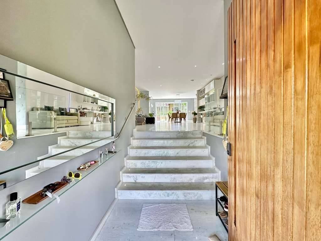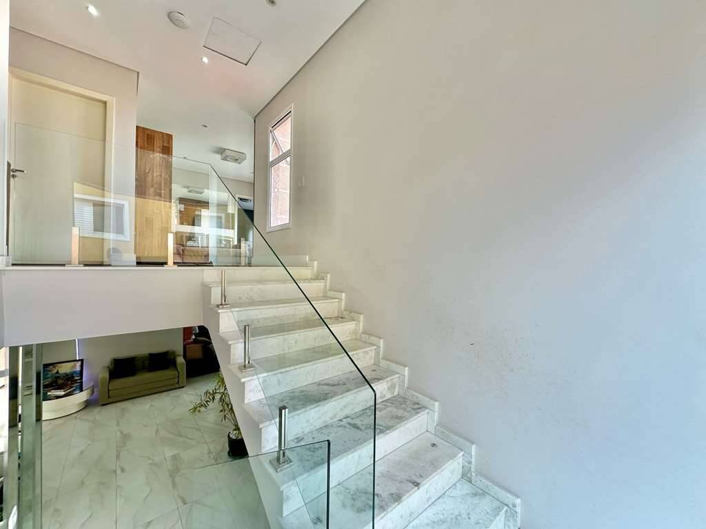 Escada de alvenaria iluminada, revestida em mármore, com guarda corpo de vidro e metal.