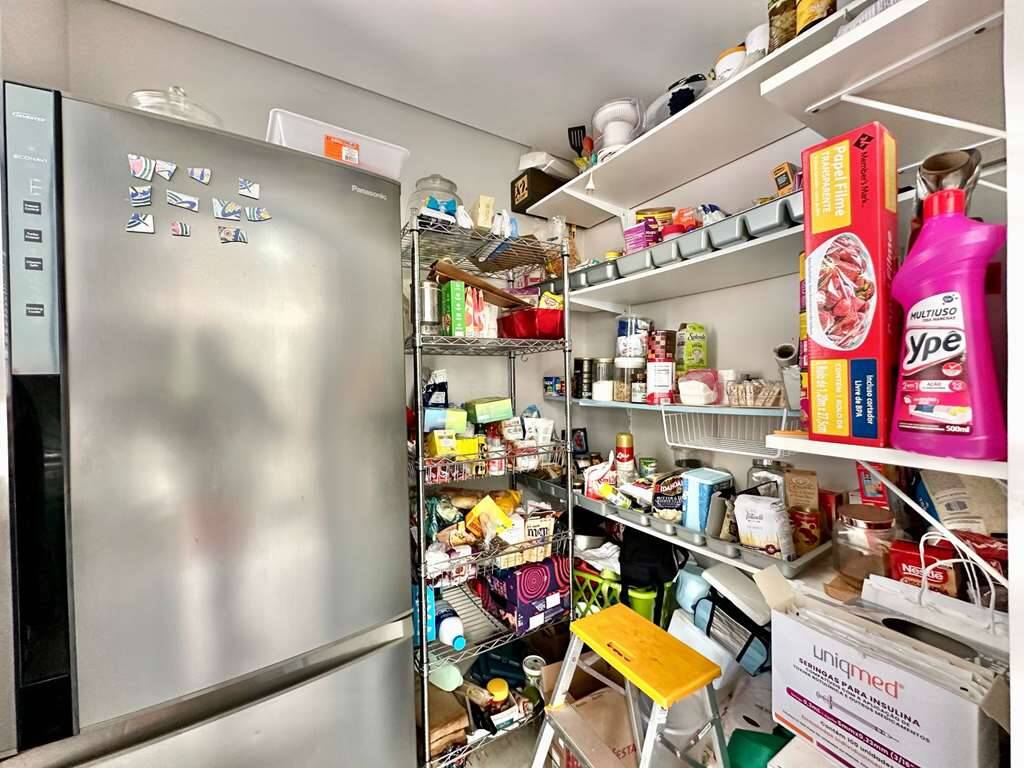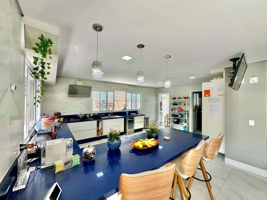 Cozinha planejada com balcão, bancadas em “U” em silestone, 2 cubas inox, torneira gourmet, micro, forno e fogão Brastemp, geladeira Electrolux Side by Side e despensa.