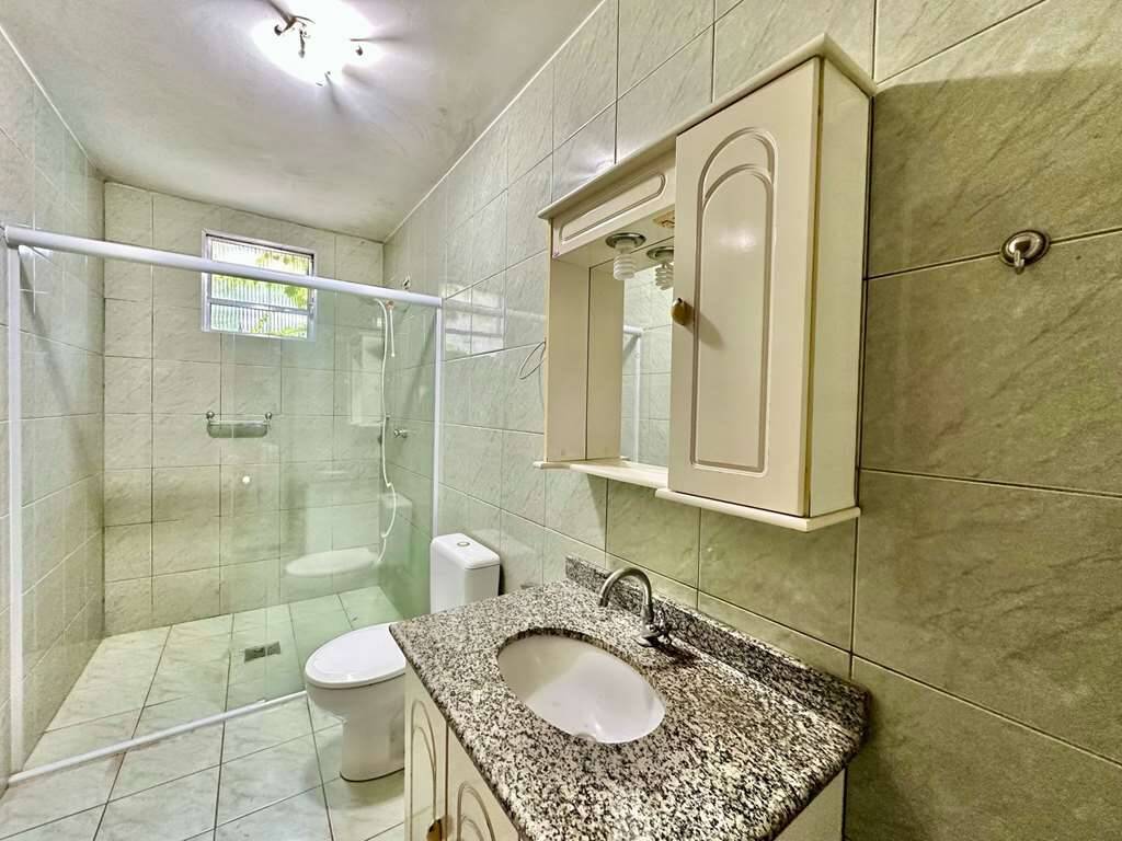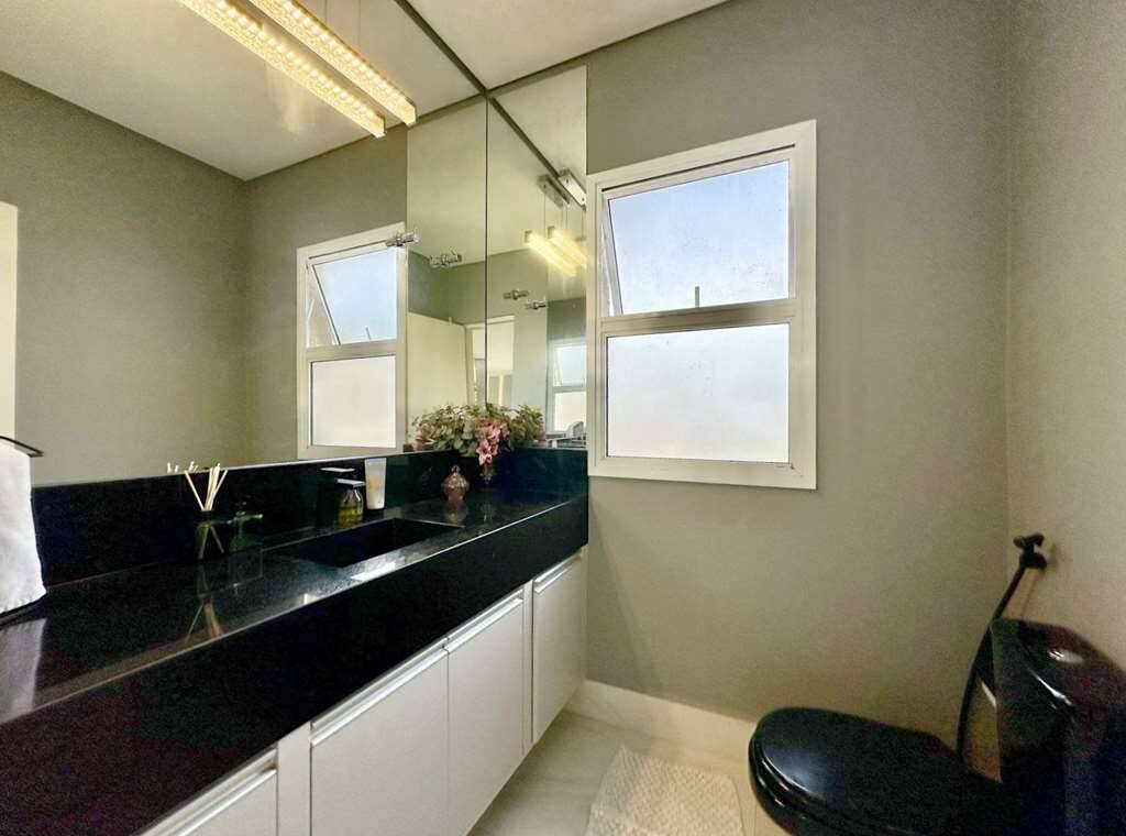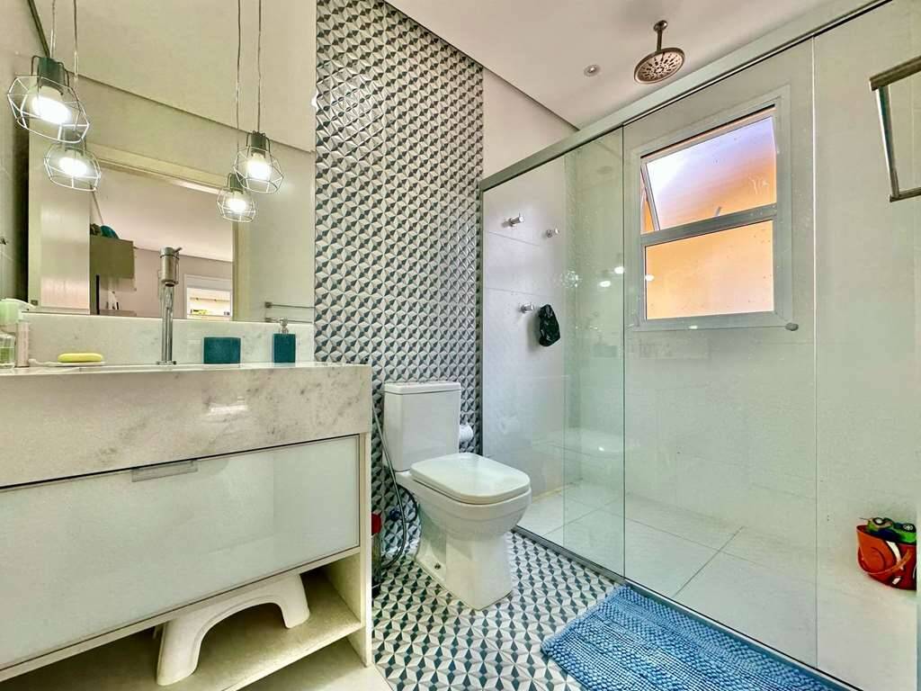 Banheiro com tampo em granito, gabinete, espelho e box de vidro, com chuveiro elétrico.