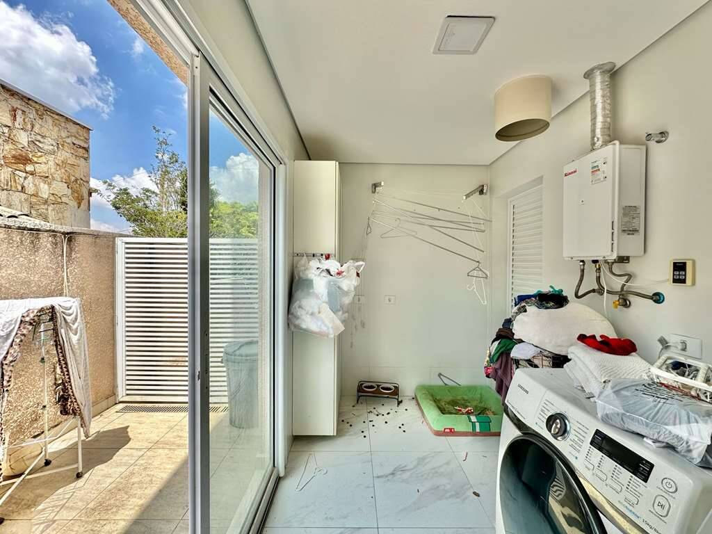 Área de serviço ensolarada e lavanderia fechada com tanque, armário e banheiro.