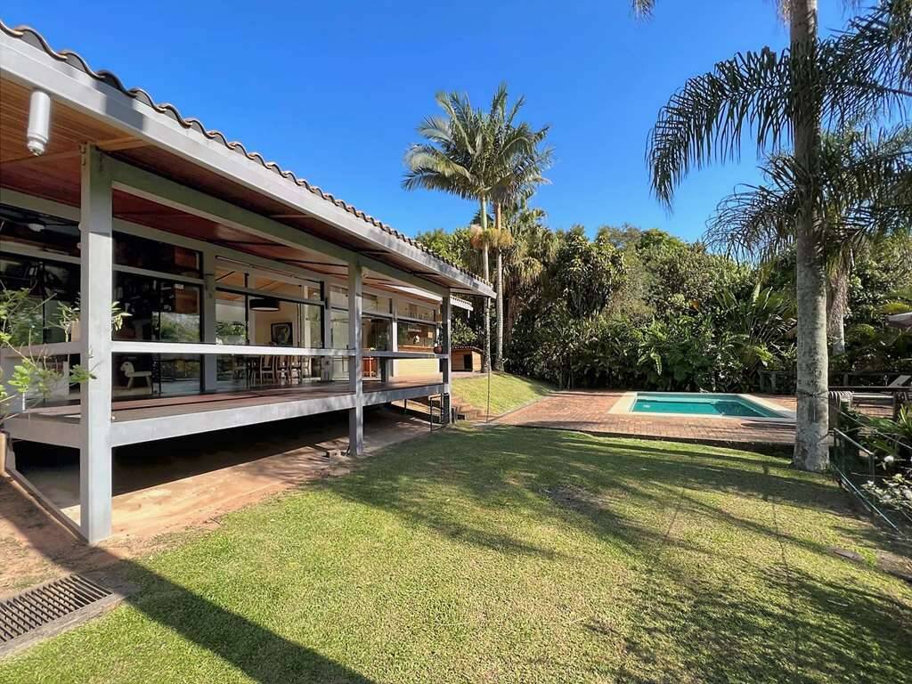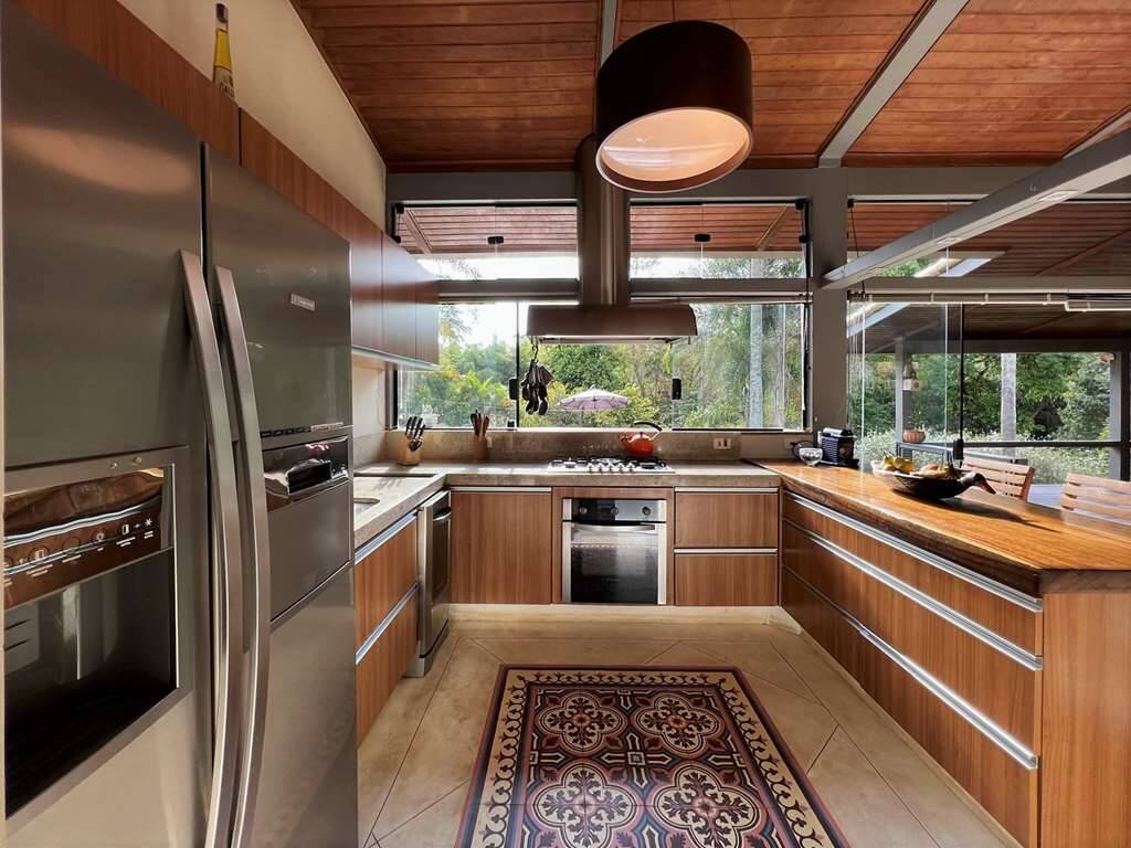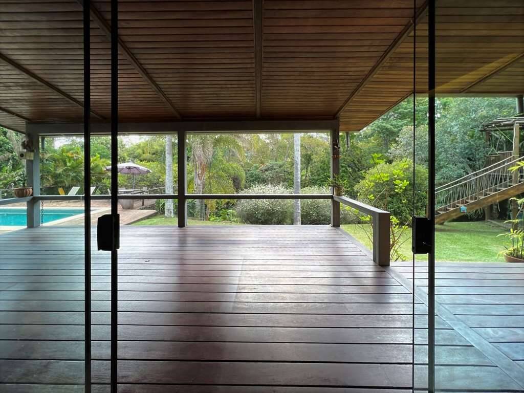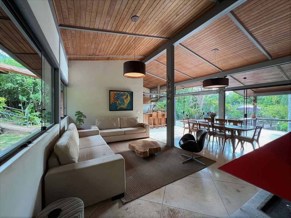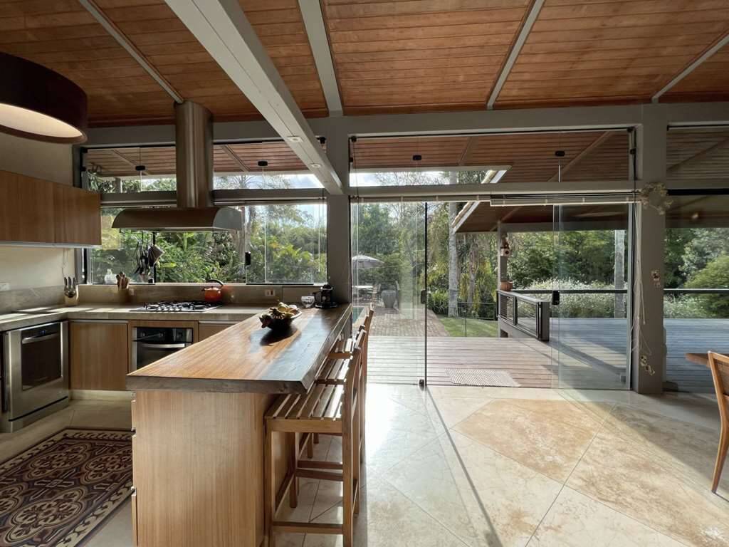 Living para 5 ambientes envidraçados, incluindo a cozinha integrada, voltados para varanda com vista, piscina e jardim.