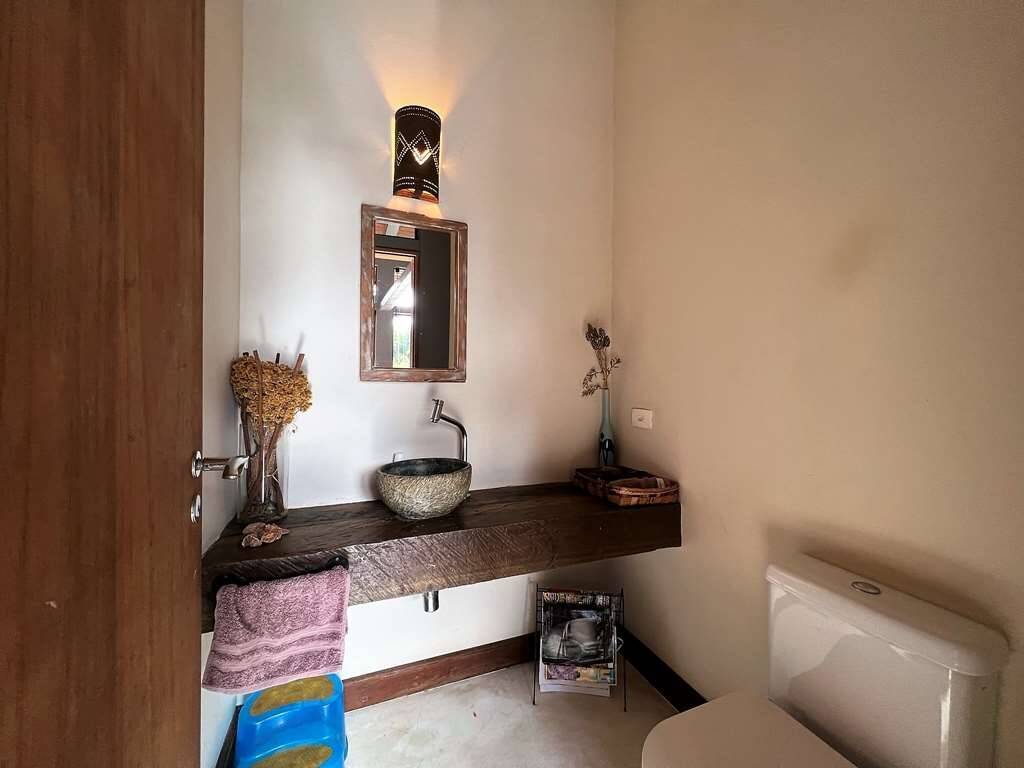Lavabo com tampo em dormentes e pia em pedra sabão.