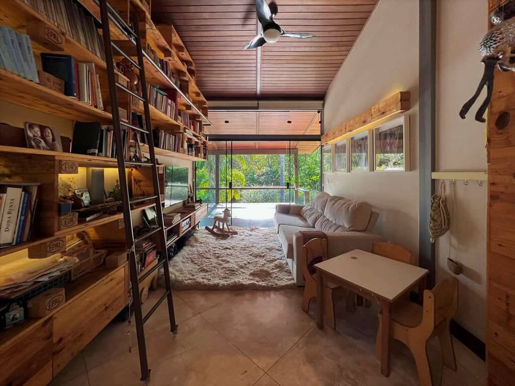 Family room com porta de correr, ideal para home theater, biblioteca, som, música ou escritório.