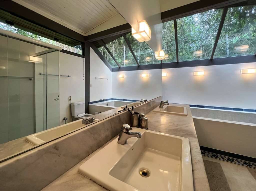 Banheiros com espelho, gabinetes, tampos em mármore e box de vidro, sendo a máster uma linda sala de banho, com 2 cubas e banheira em pastilhas, com teto de vidro.