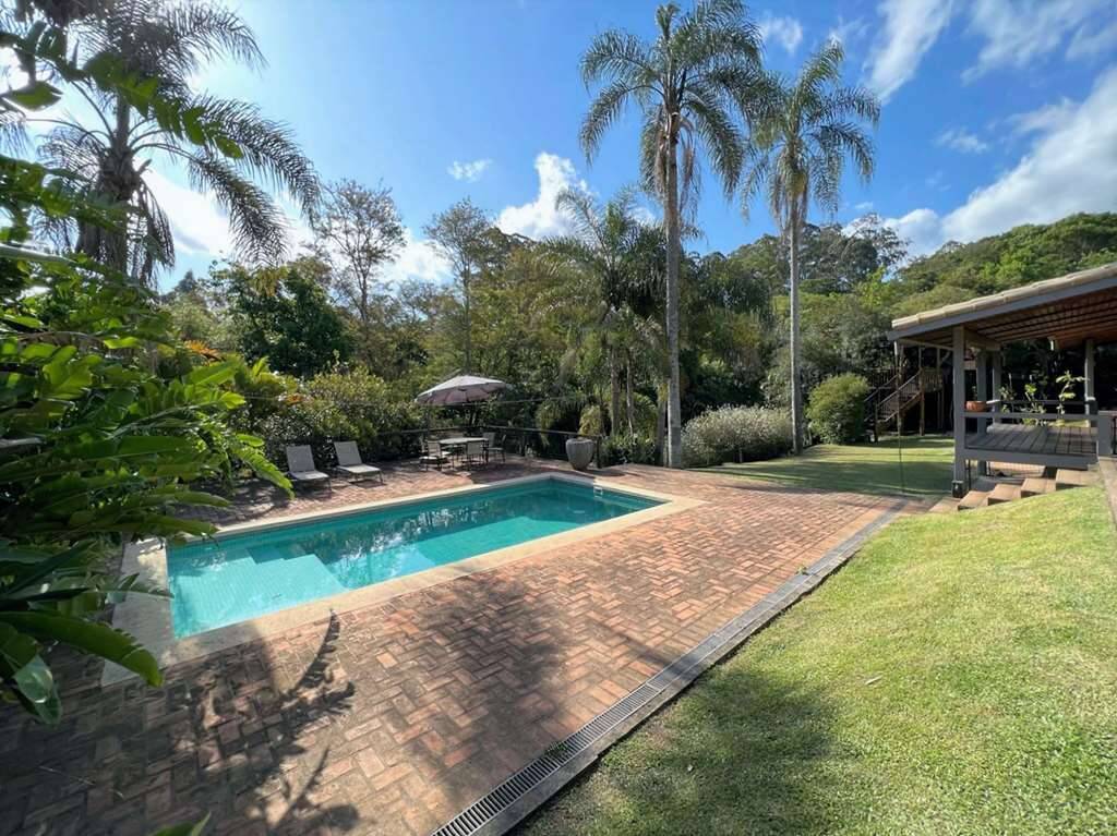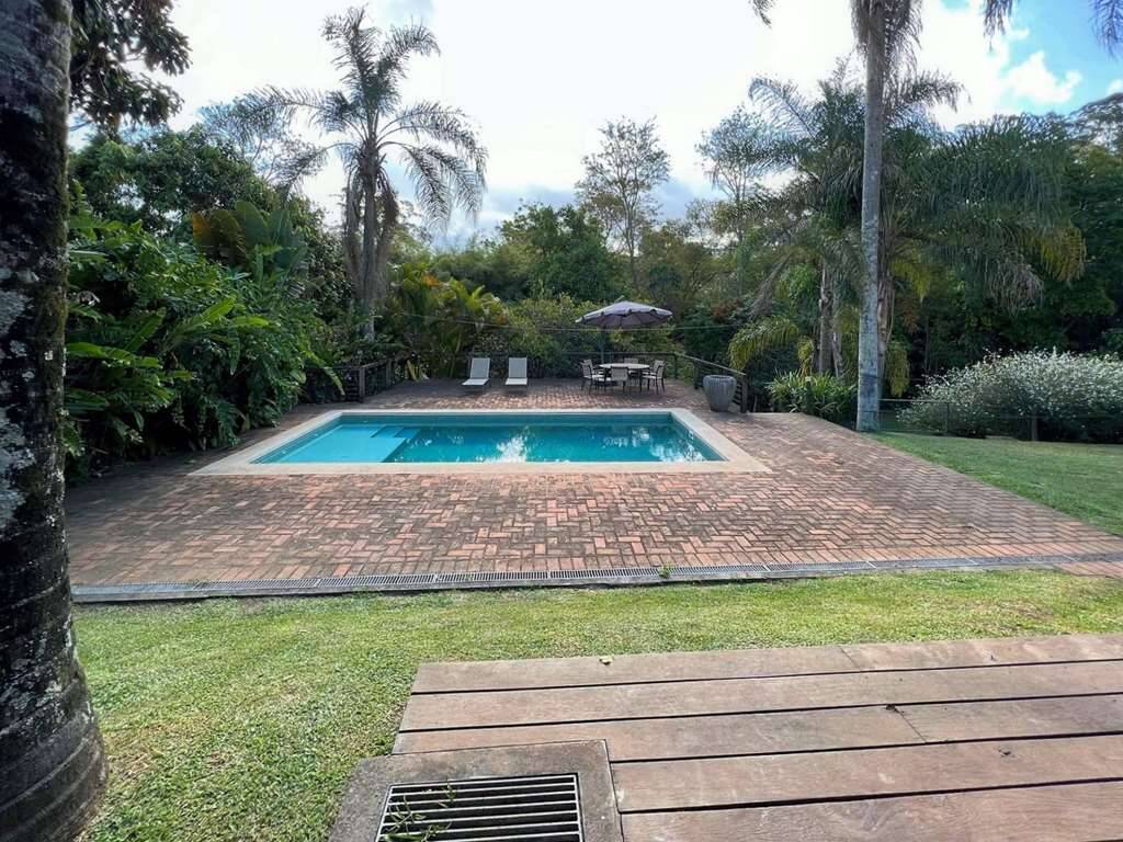 Piscina de alvenaria ensolarada, revestida em pastilhas, iluminada, preparada para aquecimento, com escada interna, hidro, prainha, solarium em deck cercado pela natureza e casa de máquinas.