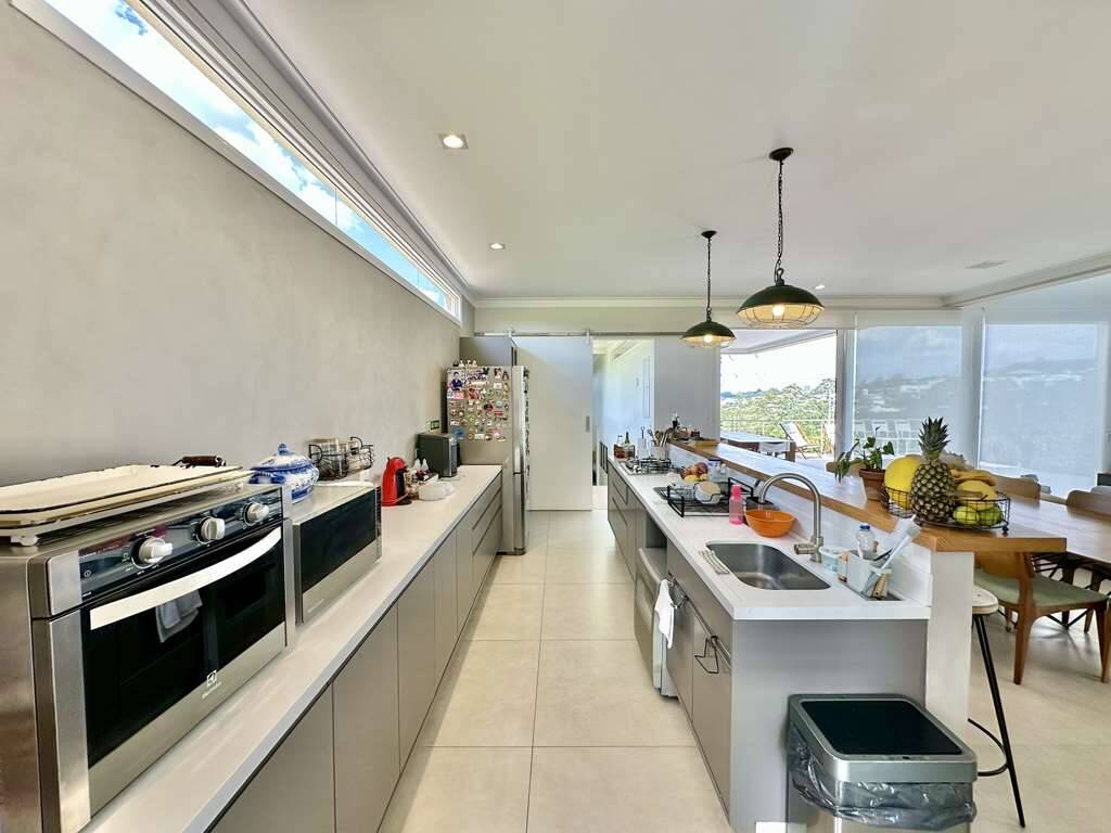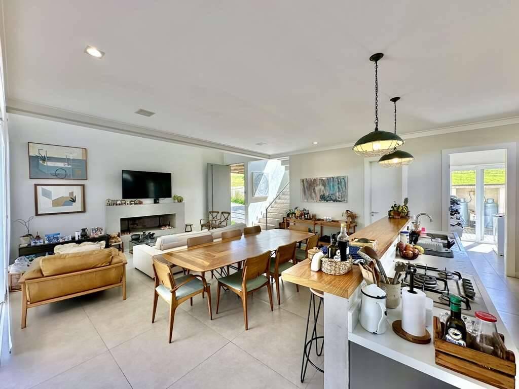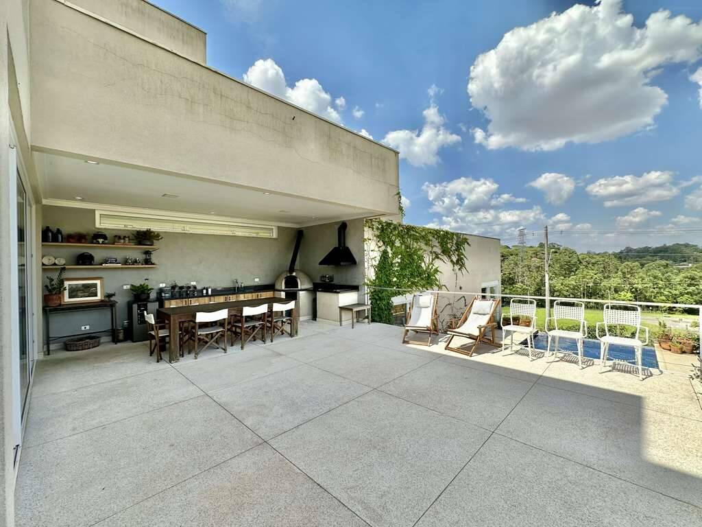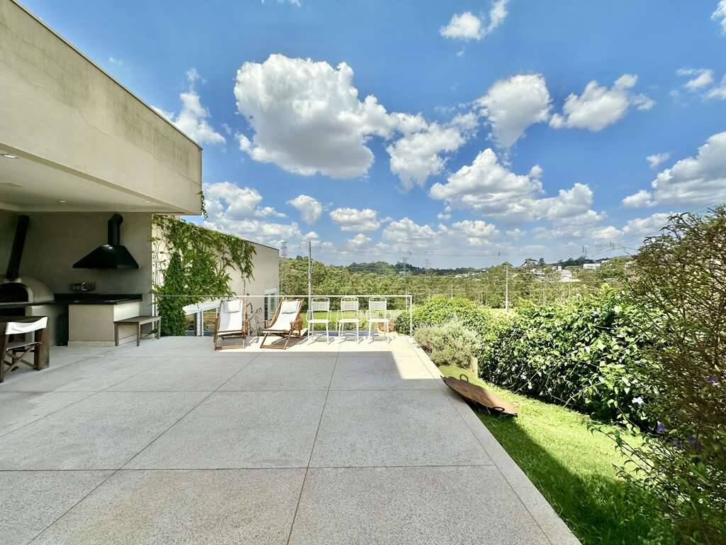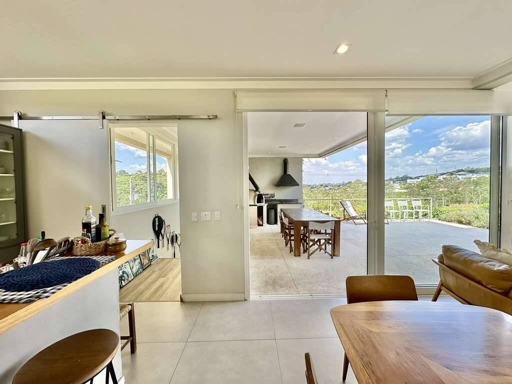 Linda casa moderna integrada com ótimo acabamento. Localização privilegiada de esquina e elevada, em final de rua tranquila, com vista para a natureza. Repleta de armários. Portas e janelas em alumínio e vidro, com persianas elétricas nos quartos. Pisos em porcelanato, revestimento de madeira e fulget. Projeto de gesso e iluminação. Louças e metais de qualidade. 3 acessos: social lazer e serviço. Casa com pé-direito alto, envidraça, ensolarada, bem arejada e iluminada. Hall social com porta pivotante. Lavabo com tampo em Travertino. Escada de alvenaria com guarda corpo de metal e cabos de aço. 4 SUÍTES com armários e ar condicionado 2 suítes no piso superior, sendo a master com closet, grande terraço e vista. 2 suítes no piso inferior voltadas para a piscina, com hall íntimo ideal para TV, estudos ou escritório. Banheiros com tampos em mármore branco prime, espelho, box de vidro e nichos, sendo 2 com claraboias e a master com 2 cubas e grande espelho. Living pra 4 ambientes integrados à cozinha e varanda gourmet. Estar, TV, lareira jantar / bar. Cozinha planejada com bancada em mármore branco prime, gabinetes, ilha, balcão e despensa. Área de serviço com depósito, lavanderia com tanque e ótimo quintal ensolarado, com banheiro de serviço. Varanda gourmet com vista, churrasqueira, forno de pizza, bancada, pia inox e gabinetes. Piscina com 7m x 3,5m, iluminada, com borda infinita, prainha, solarium e vista. Prepara para receber unidade de aquecimento. Redario para 3 redes com vista. Suíte de serviço com acesso externo. Garagem para 6 vagas, sendo: 2 vagas em cima, pela na entrada social, com pergolado + 4 vagas em baixo, sendo 2 cobertas na garagem c/ portão automático e 2 externas. Oficina ao lado da garagem, com banheiro de apoio. Aquecimento central da água: Gás de passagem. Abastecimento de água: Sabesp. Imóvel OCUPADO. Agendar com antecedência mínima de 24 horas via mPm.