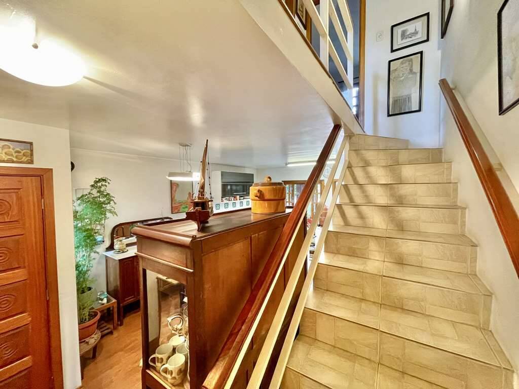 - Escada de alvenaria com guarda corpo de ferro e corrimão de madeira.