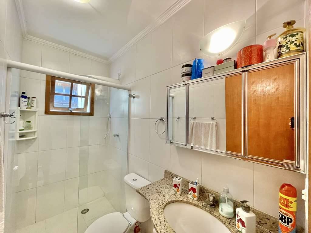 - Banheiros com tampos em granito, espelho e box de vidro.