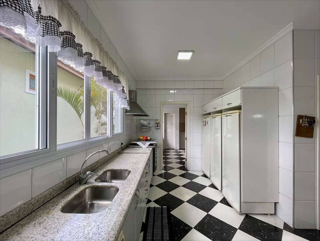Copa cozinha planejada Elgin repleta de armários, com 3 bancadas, sendo 1 grande em “L”, 2 cubas, gabinetes. Fogão 5 bocas Electrolux e coifa inox.