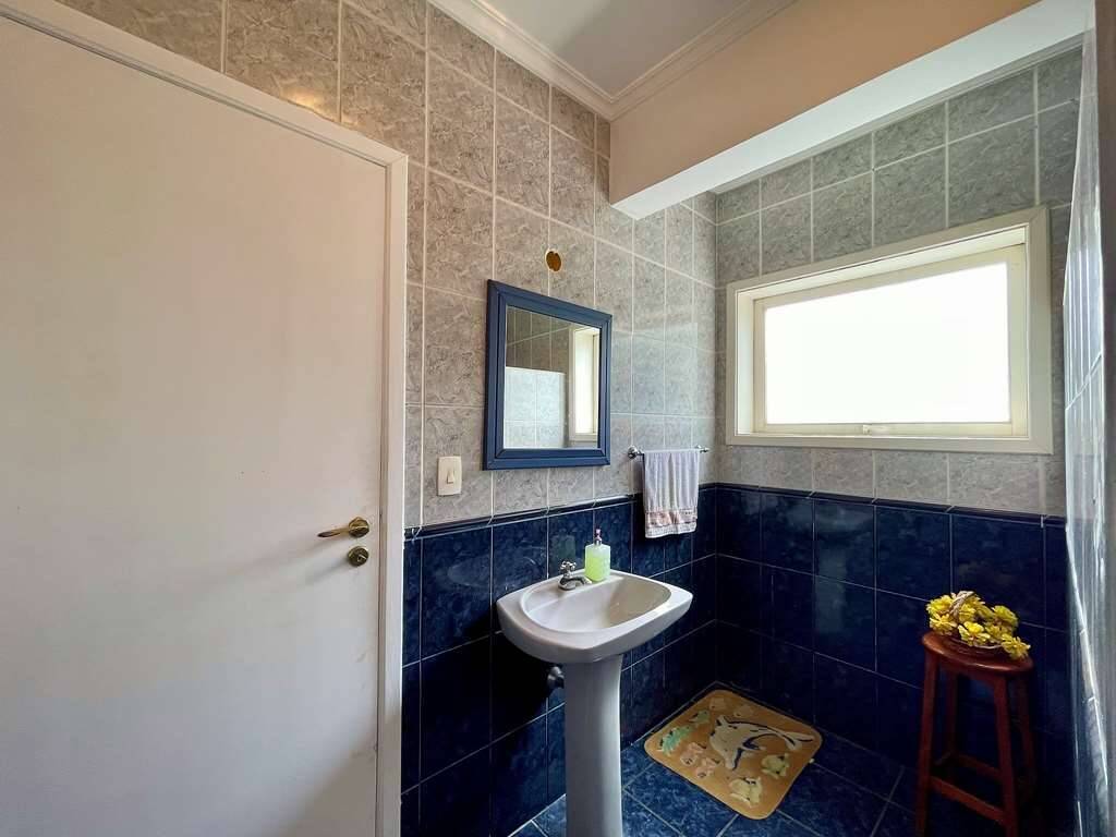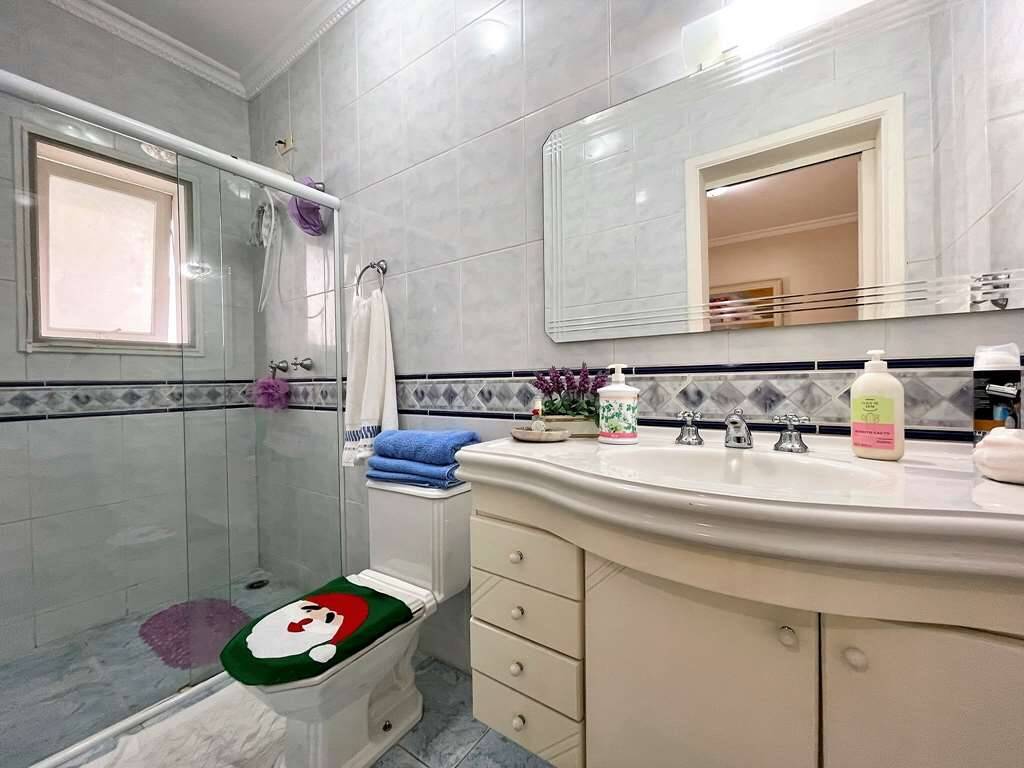 Banheiros com tampos em resina, espelhos, gabinetes e box de vidro. A master com 2 cubas e hidro dupla panorâmica.
