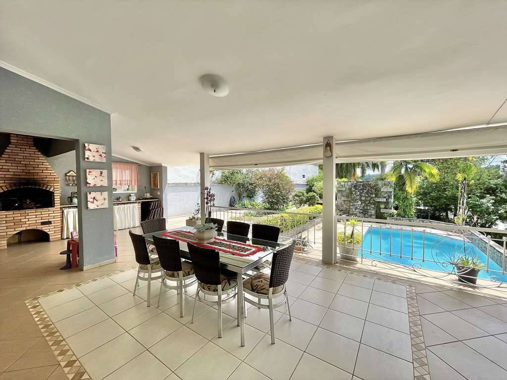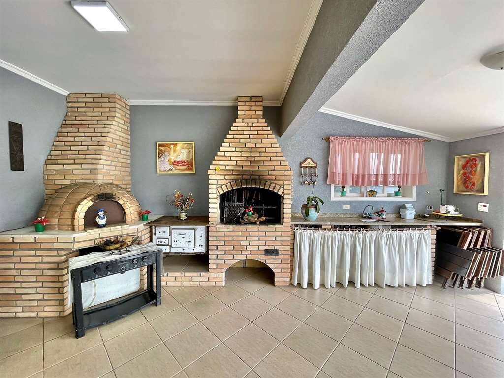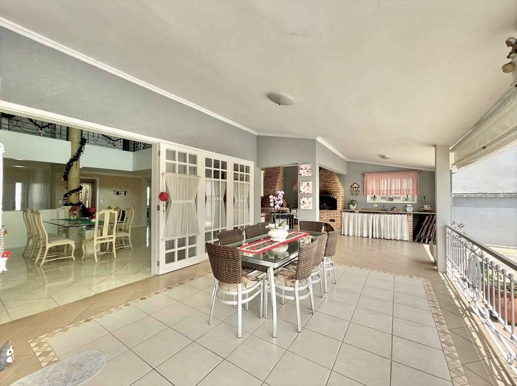 Varanda Gourmet grande para até 5 ambientes, comportando umas 40 pessoas voltada para a piscina e jardim. Com churrasqueira, forno de pizza, bancada e pia.