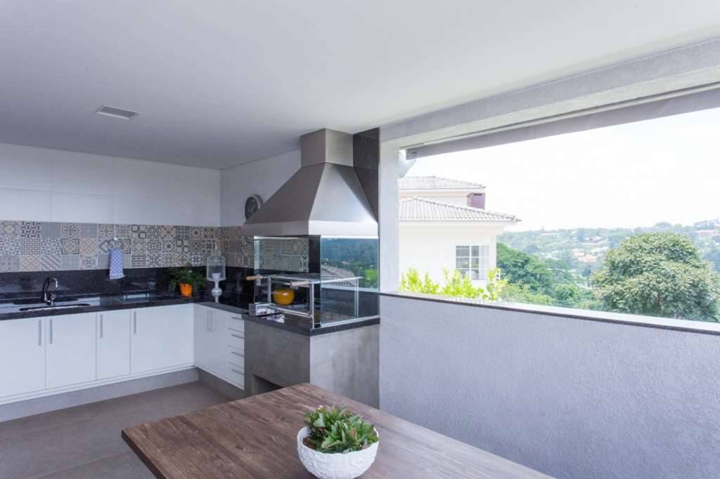 Espaço gourmet integrado a piscina e a cozinha, com enorme bancada toda em granito e pia, churrasqueira a carvão com rotação dos espetos elétrica