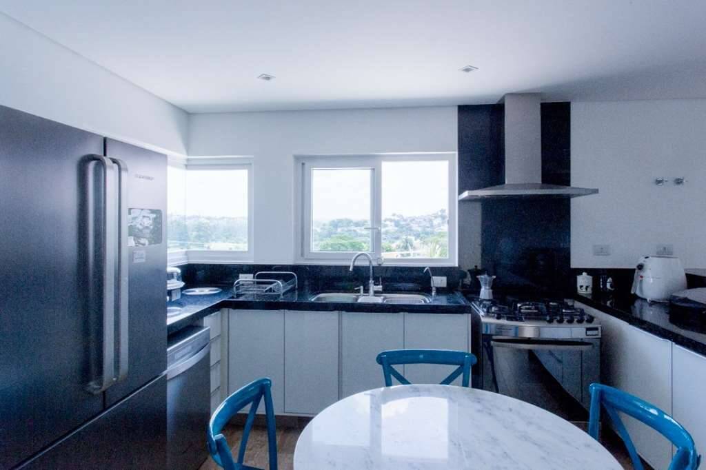 Copa/cozinha planejada com armários e gabinetes, bancada de granito em L, 3 cubas, triturador elétrico, fogão de 5 bocas com forno elétrico Brastemp Gourmand com coifa importada