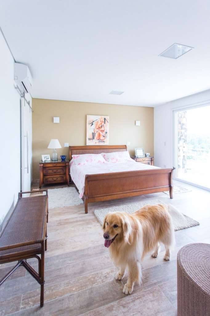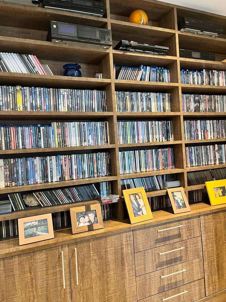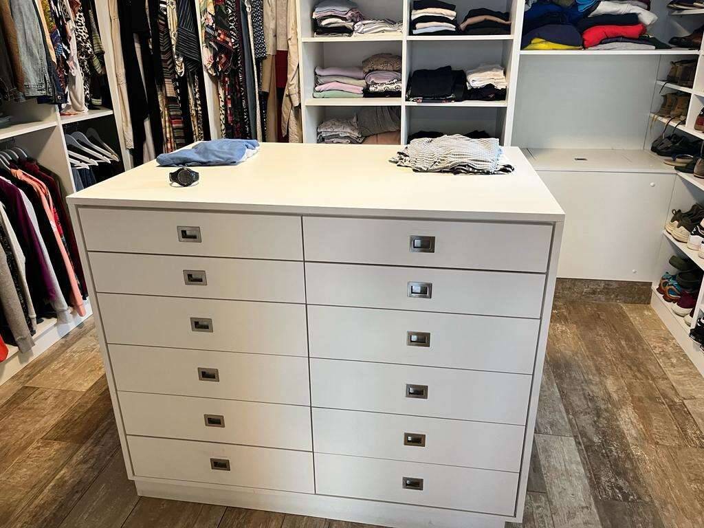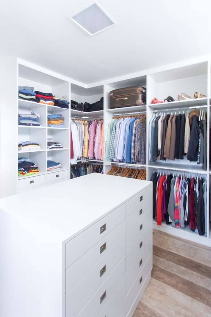 Suíte master com cerca de 24 m2, com quarto de vestir de 16 m2 todo cercado com armários, gaveteiros e prateleiras planejados, e