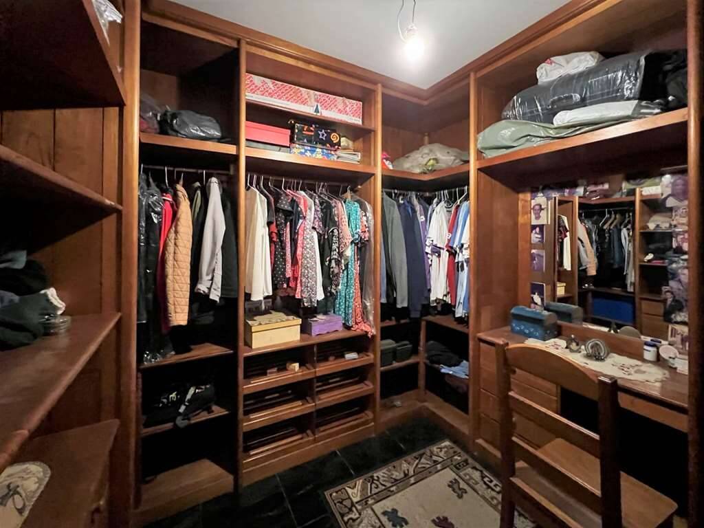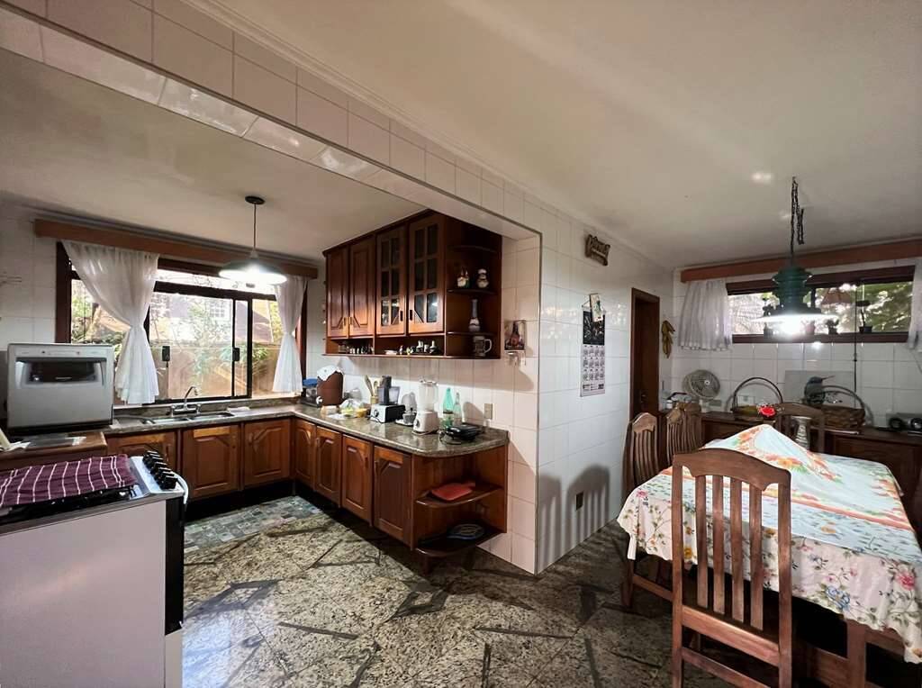 - Cozinha com sala de almoço, porta de correr, repleta de armários e aparador, em madeira maciça de marcenaria sob medida. Bancada em “L” em granito, 2 cubas inox e despensa com prateleiras em granito.