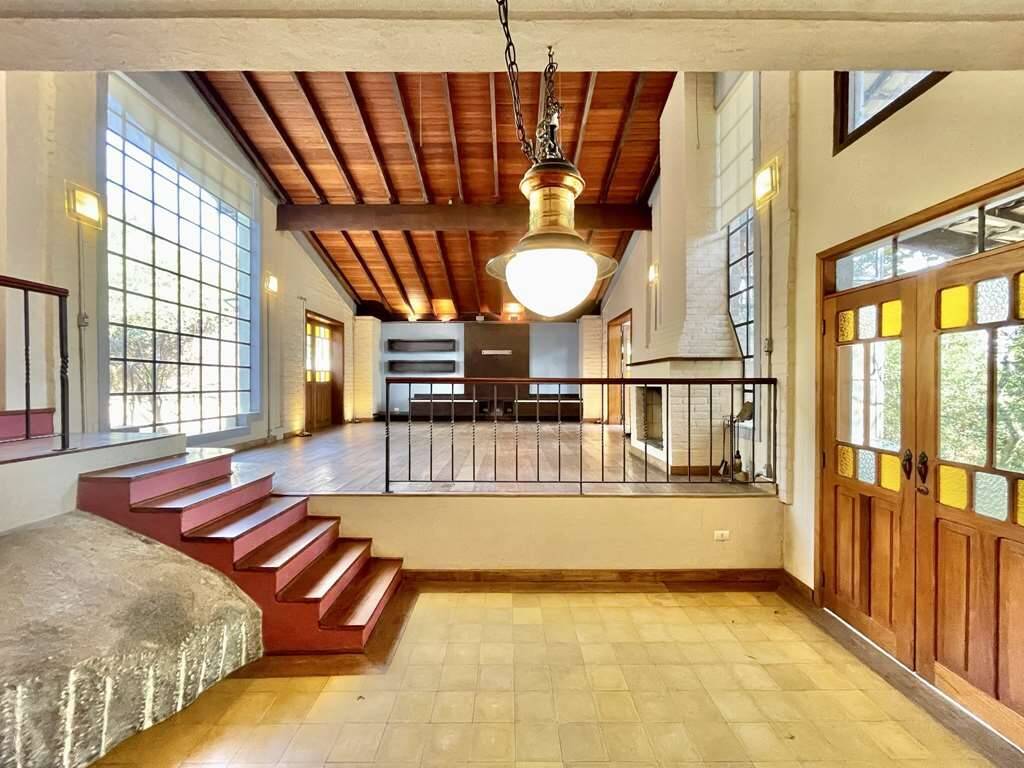 Salas de estar, TV, lareira e sala de jantar em desnível com uma pedra natural do terreno que foi mantida no seu lugar de origem.