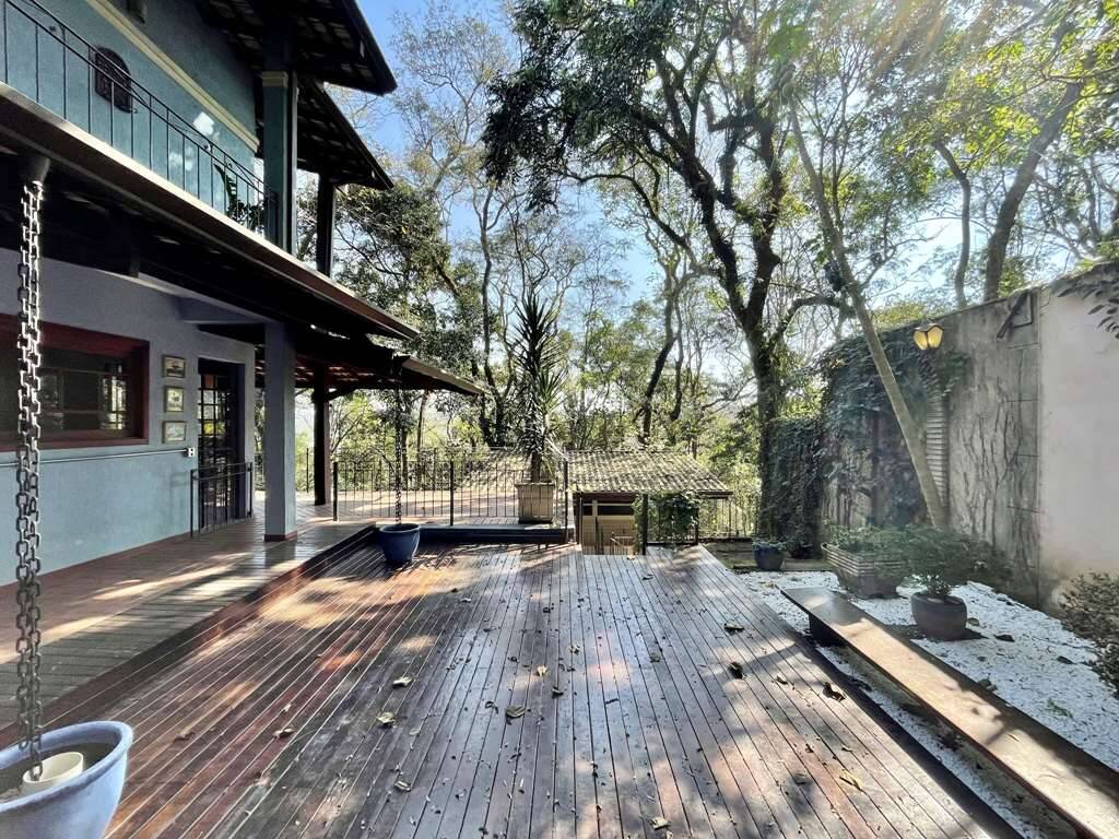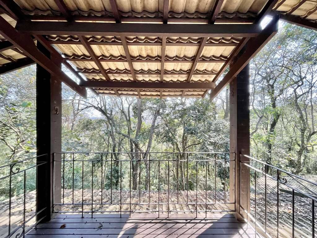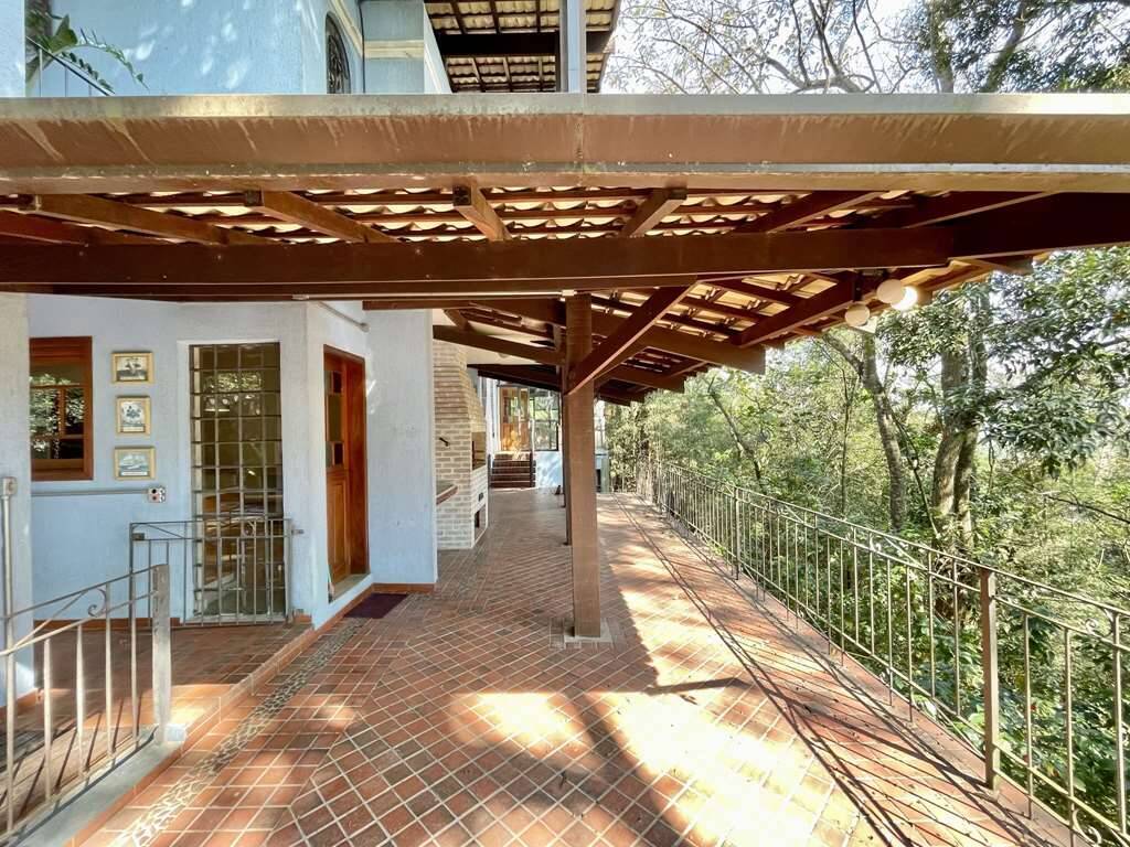 Porta balcão de acesso à grande varanda gourmet debruçada sobre a mata, com grande churrasqueira, pia, bancada, passa pratos e vista privilegiada.