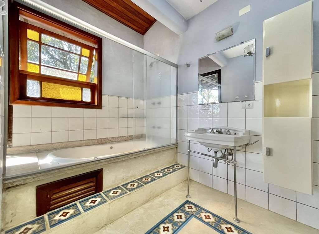 Banheiros com piso em cimento queimado e ladrilho hidráulico, box de vidro.