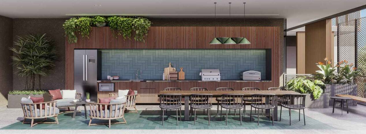 Salão de festas com espaço gourmet e lounge com churrasqueira e forno de pizza, coworking integrado