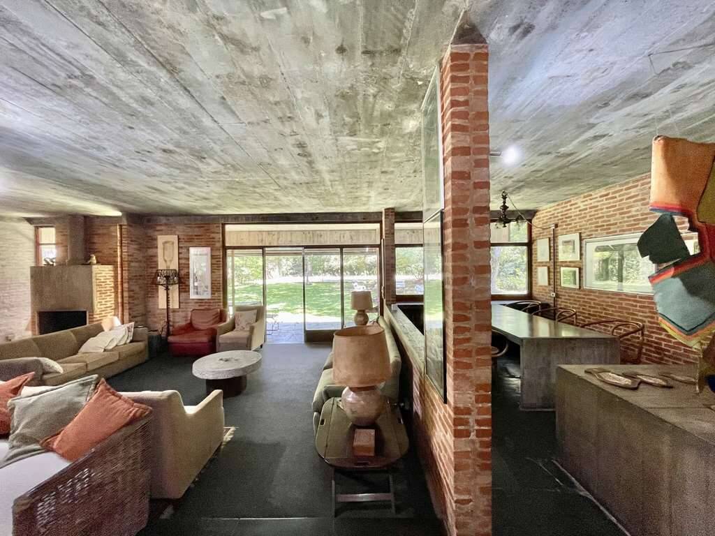 Bar com bancada em concreto, estar, TV, lareira em desnível, jantar mais reservada com mesa e aparador de concreto e uma ilha aparador de concreto com armários gabinetes.