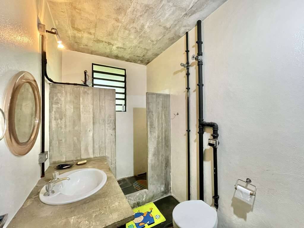2 Banheiros com lavatório externo com bancadas e box de concreto, espelho, gabinetes e bidês. Sendo a máster com piso do box de pedra.