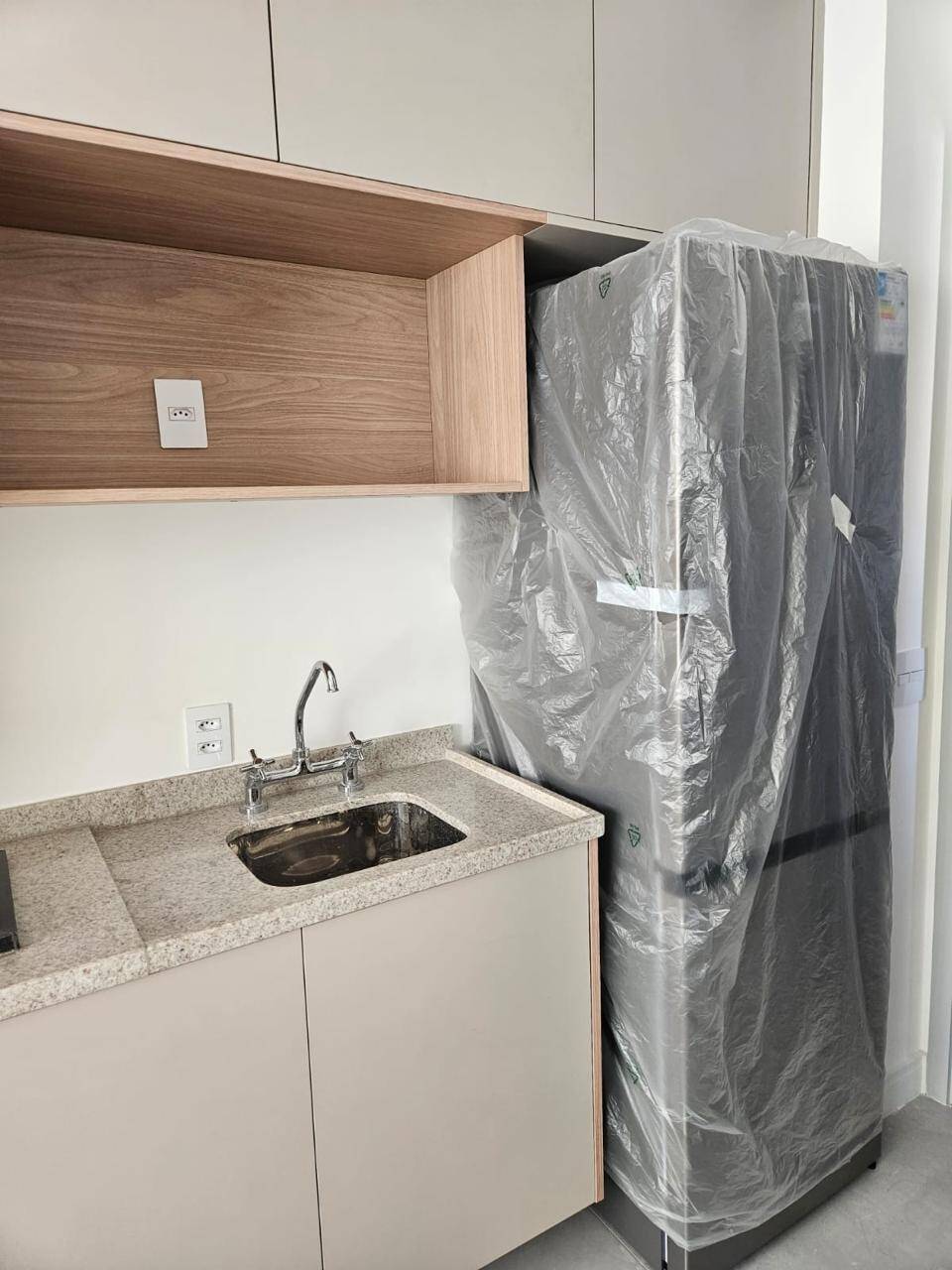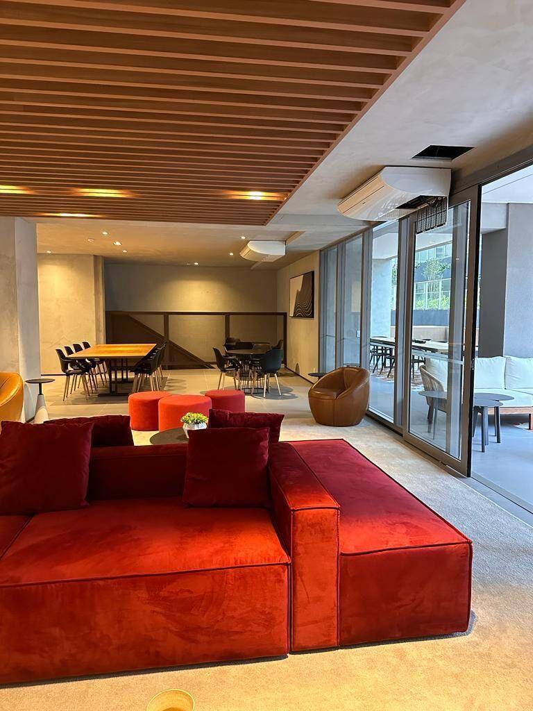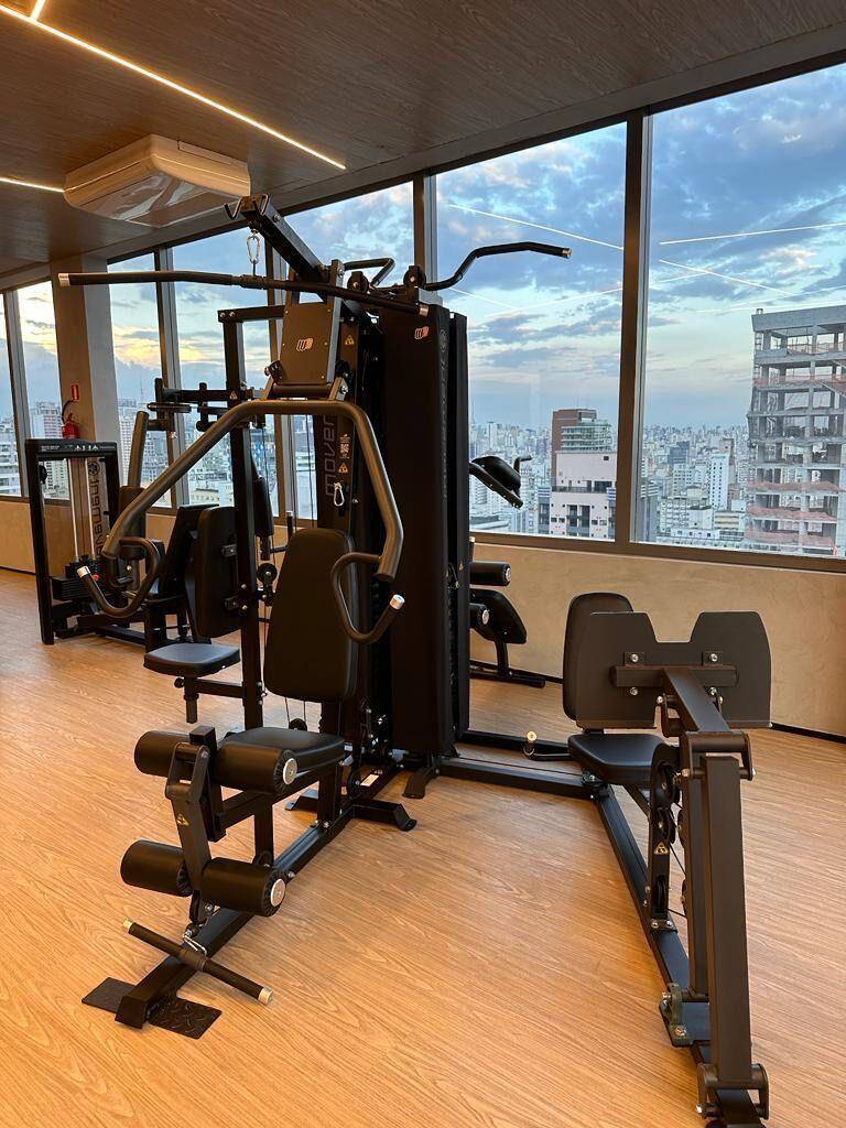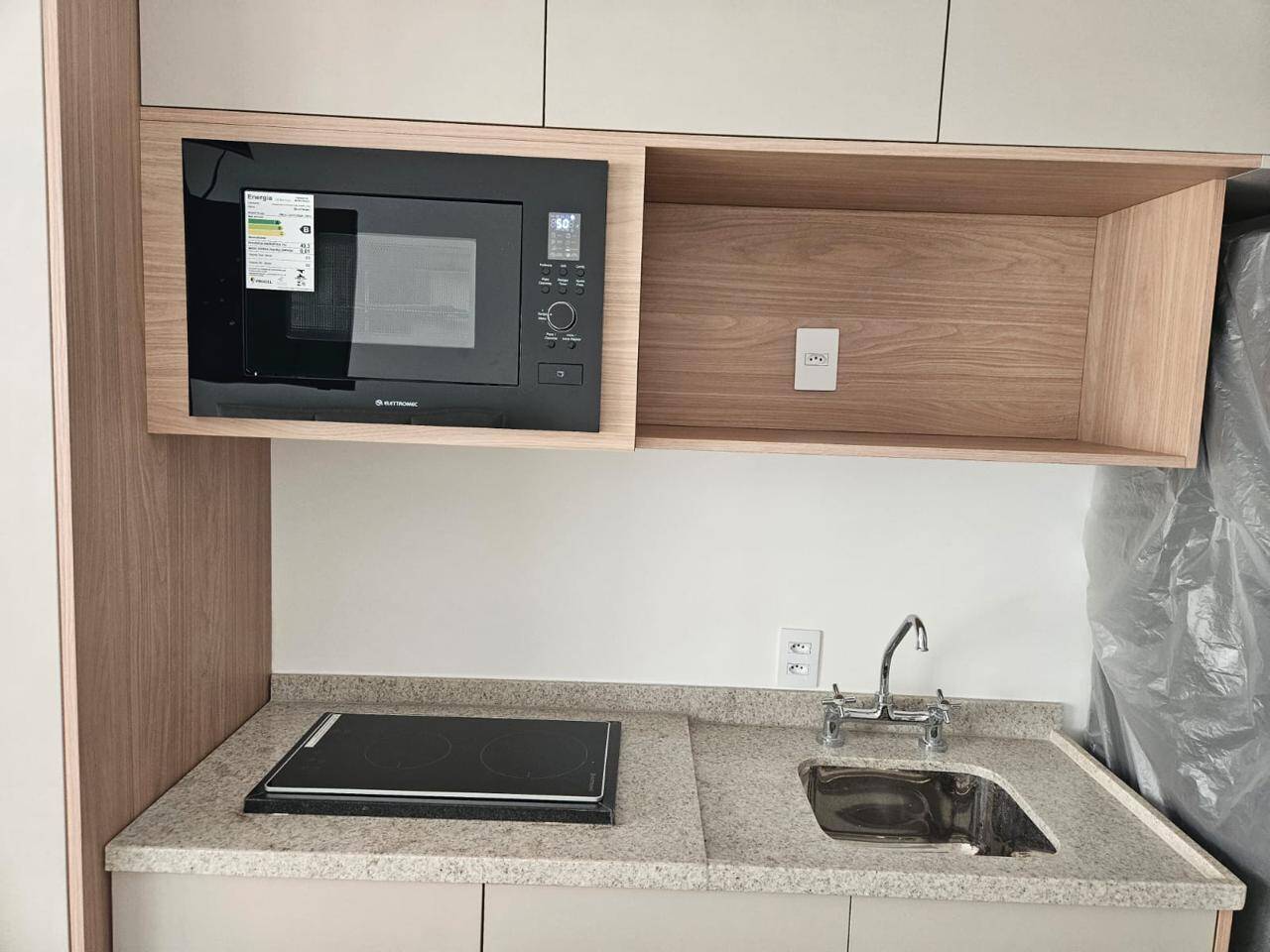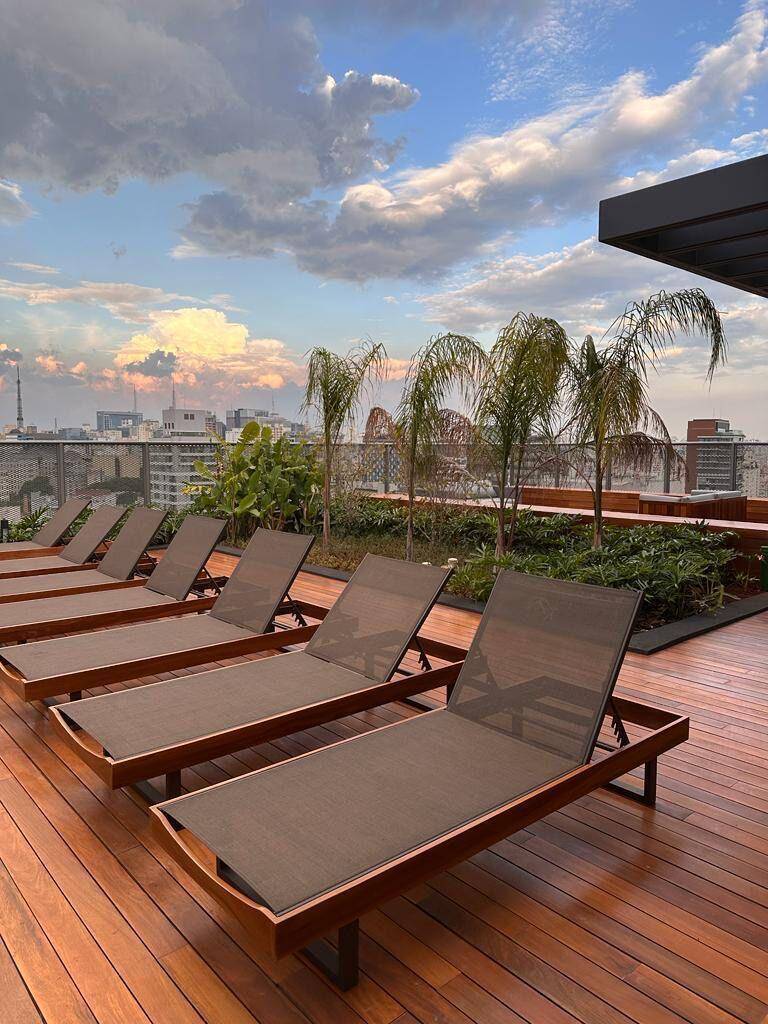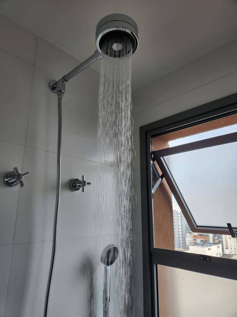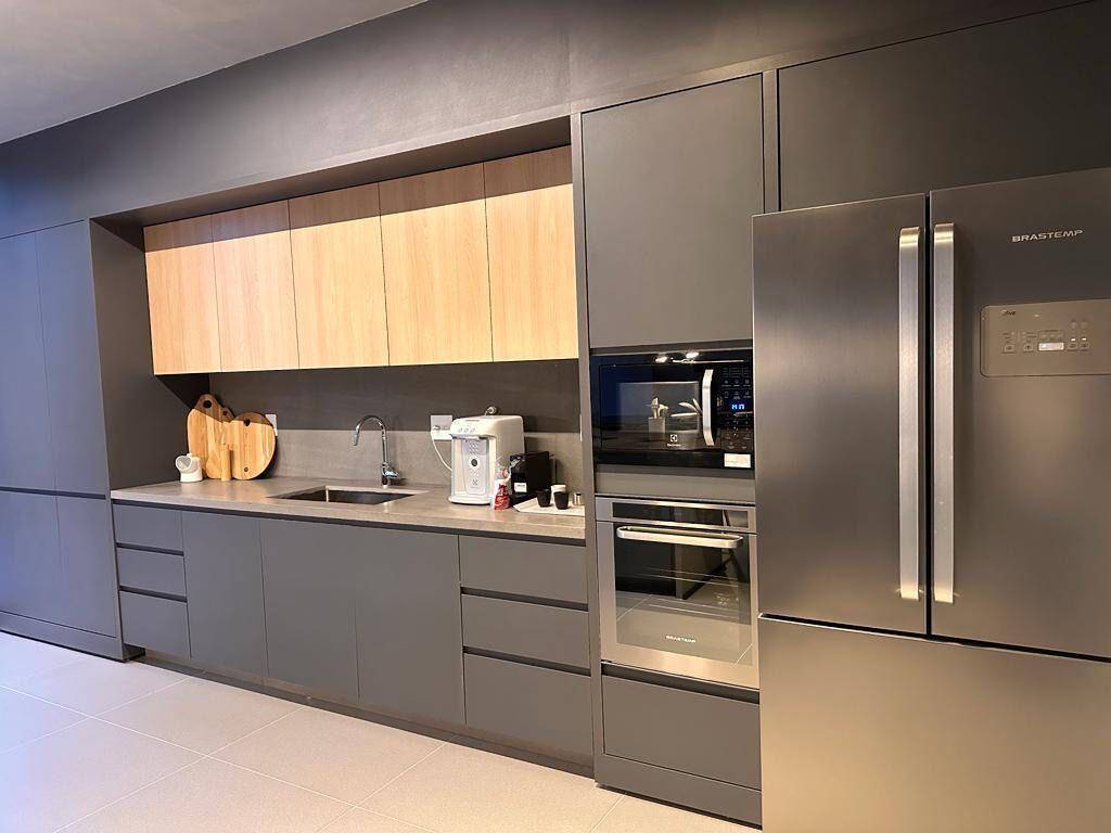 Totalmente mobiliado com ar condicionado, geladeira, cocktop, microondas, armários, cama, televisão, persiana, cortina Black out