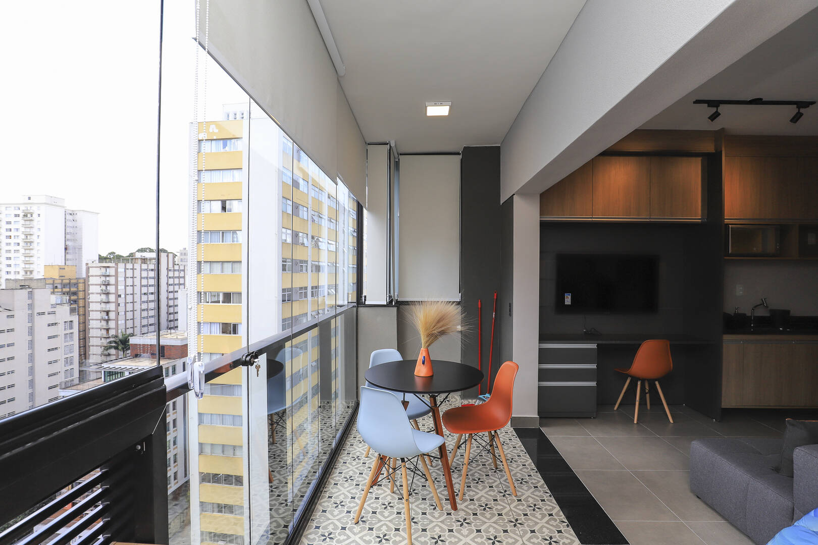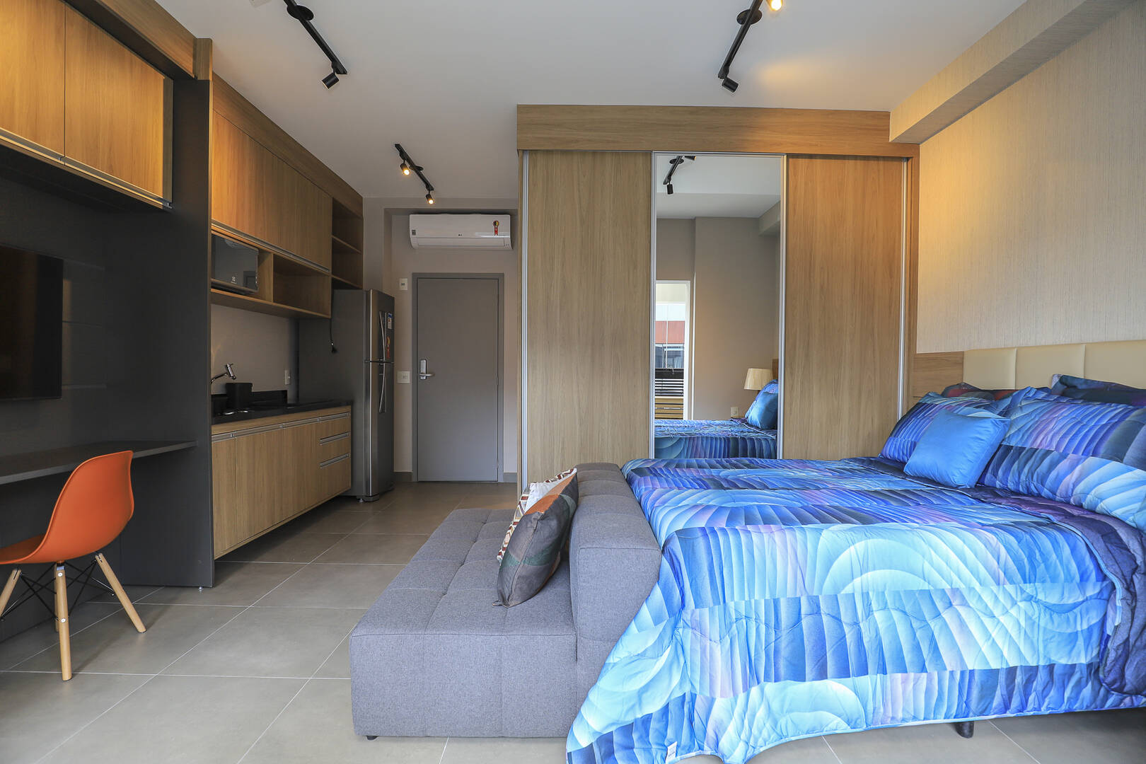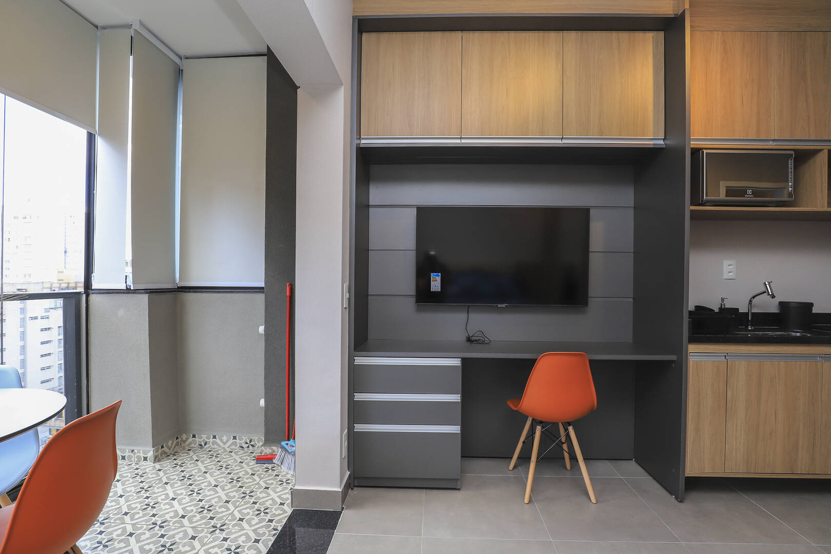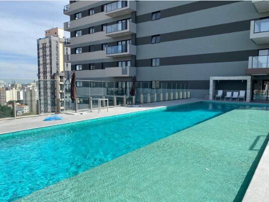 Studio mobiliado com 1 dormitório, 1 banheiro cozinha e varanda.