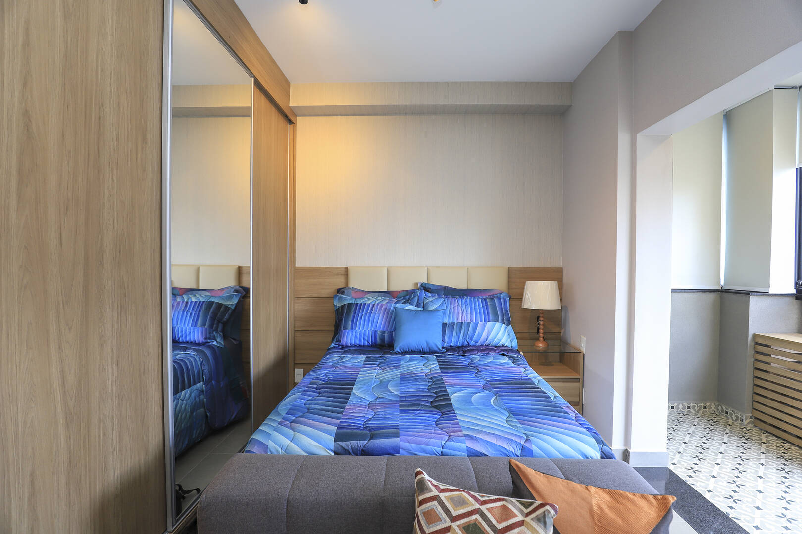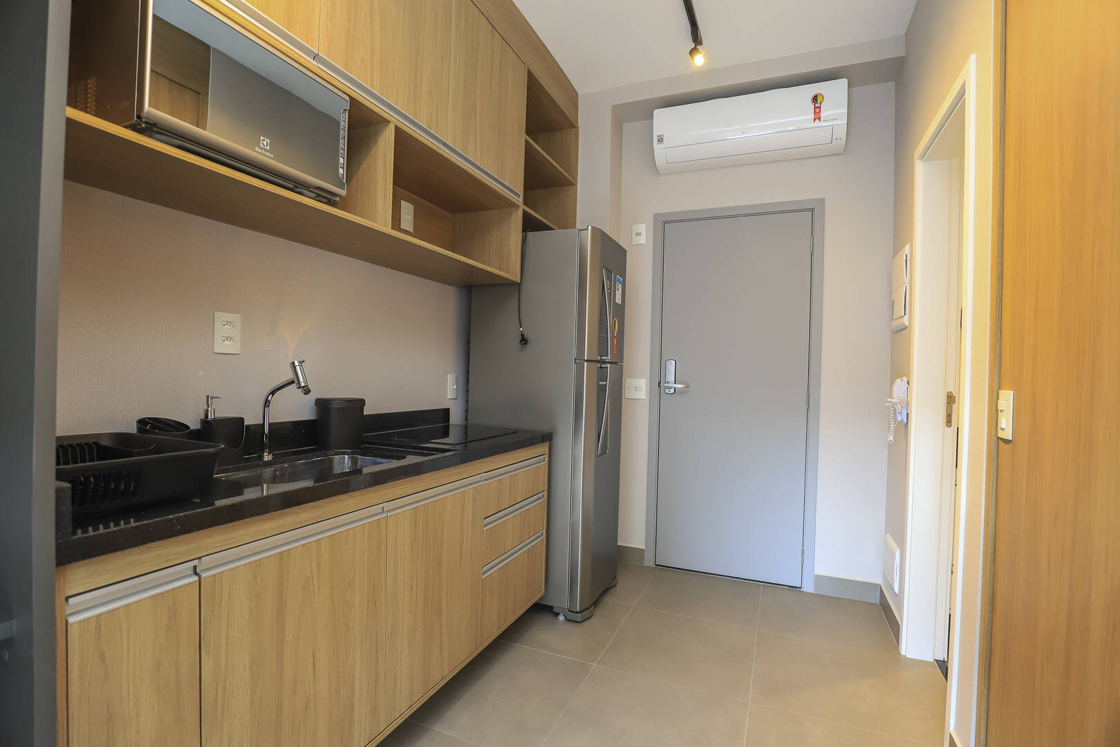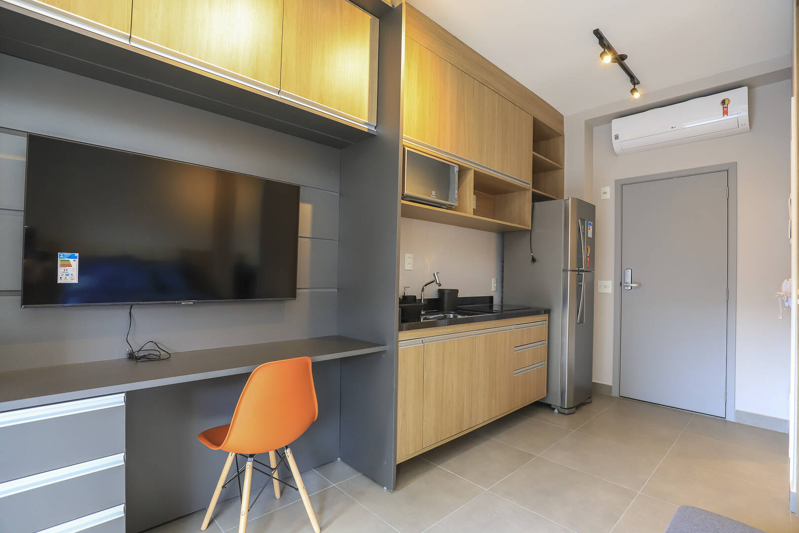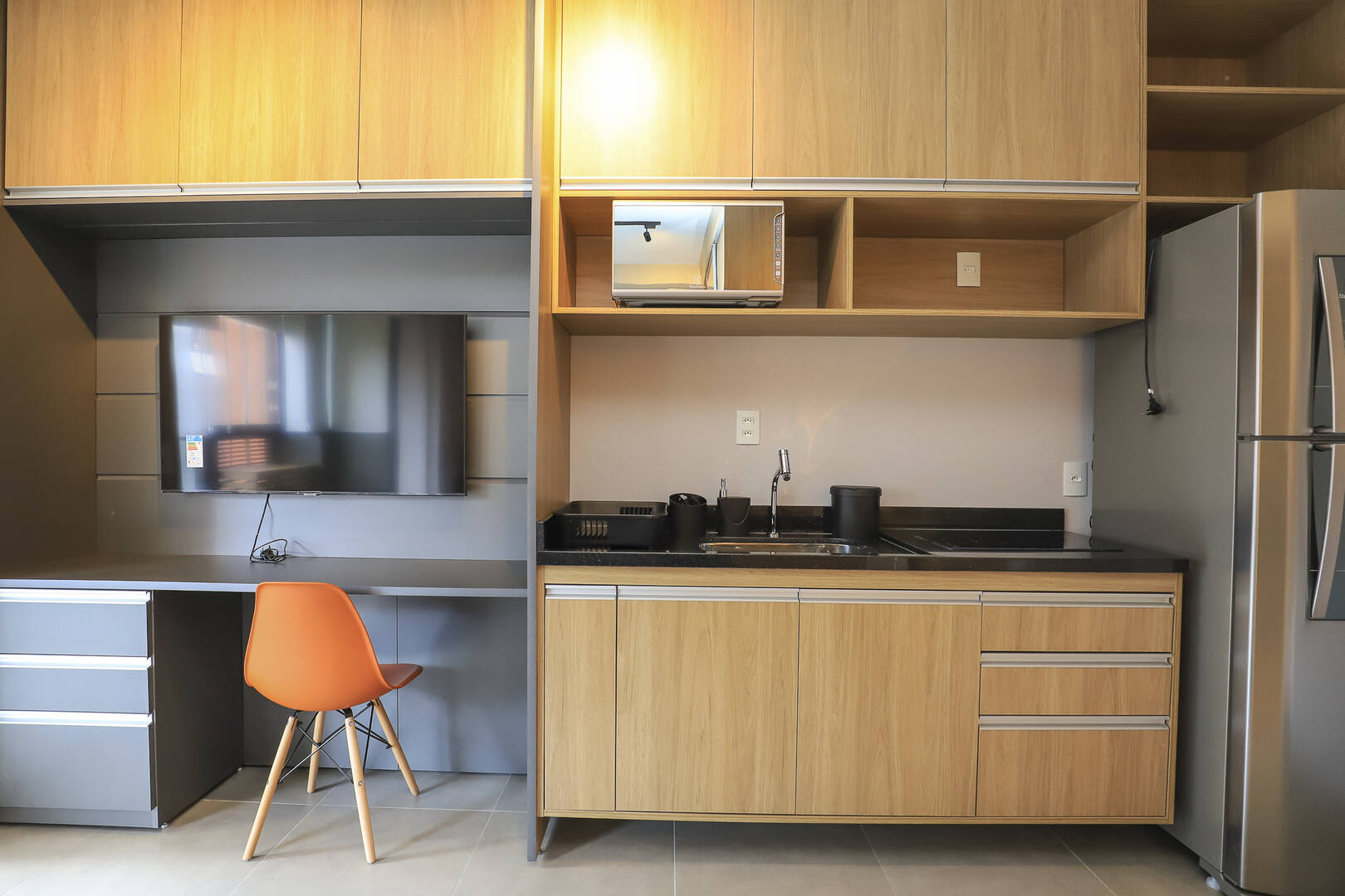 Studio mobiliado com 1 dormitório, 1 banheiro cozinha e varanda.