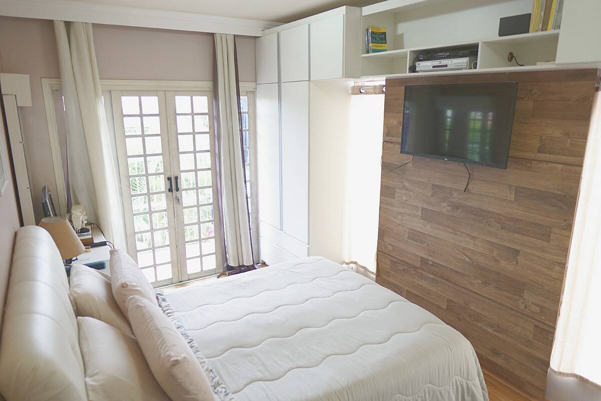 ? 01 Suíte Máster ampla, iluminada e arejada com banheira de hidromassagem armários e varanda com vista do quintal.